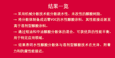 一般來說,醇酸樹脂油度越短,醇酸樹脂熔融(通常高于水的沸點)所需的溫度越高;因此,該技術通常僅限于中油度和長油度醇酸樹脂。通常,該乳液的儲存穩定性較低,此外由于大量的表面活性劑遷移至涂層表面,會導致早期耐水性或防腐性的下降。