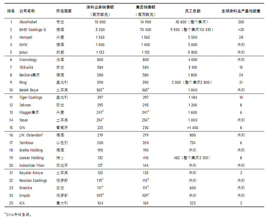 在歐洲,有很多涂料生產商積極活躍在涂料行業。《歐洲涂料雜志》根據各公司的收益情況,對總部設在歐洲大陸的歐洲涂料行業前25名進行了排行。