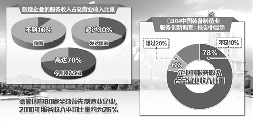 其中,有一個對企業服務型制造發展的量化指標,即示范企業服務收入占銷售收入的比重達到30%左右。對此,工信部產業政策司相關負責人解釋說,按照中國機械工業聯合會與德勤聯合發布的《2014中國裝備制造業服務創新調查》報告顯示,78%調查企業的服務收入占總營業收入比重不足10%,只有6%的調查企業占比超過20%。德勤調查了80家全球領先制造業企業,2010年服務收入平均比重約為26%。綜合相關調研成果,《行動指南》把示范企業服務收入占比設定在30%左右是完全可行的,也充分體現了發展的趨勢和要求。