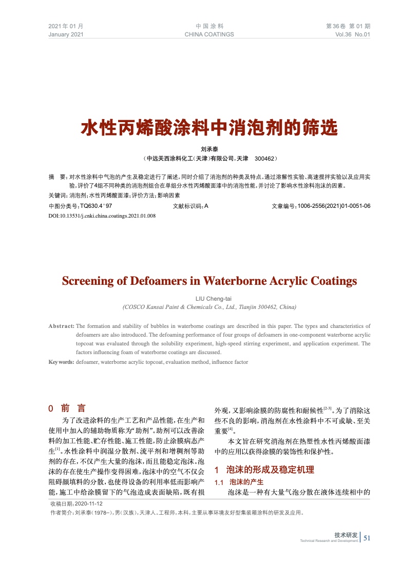 對水性涂料中氣泡的產生及穩定進行了闡述,同時介紹了消泡劑的種類及特點。通過溶解性實驗、高速攪拌實驗以及應用實驗,評價了4組不同種類的消泡劑組合在單組分水性丙烯酸面漆中的消泡性能,并討論了影響水性涂料泡沫的因素。