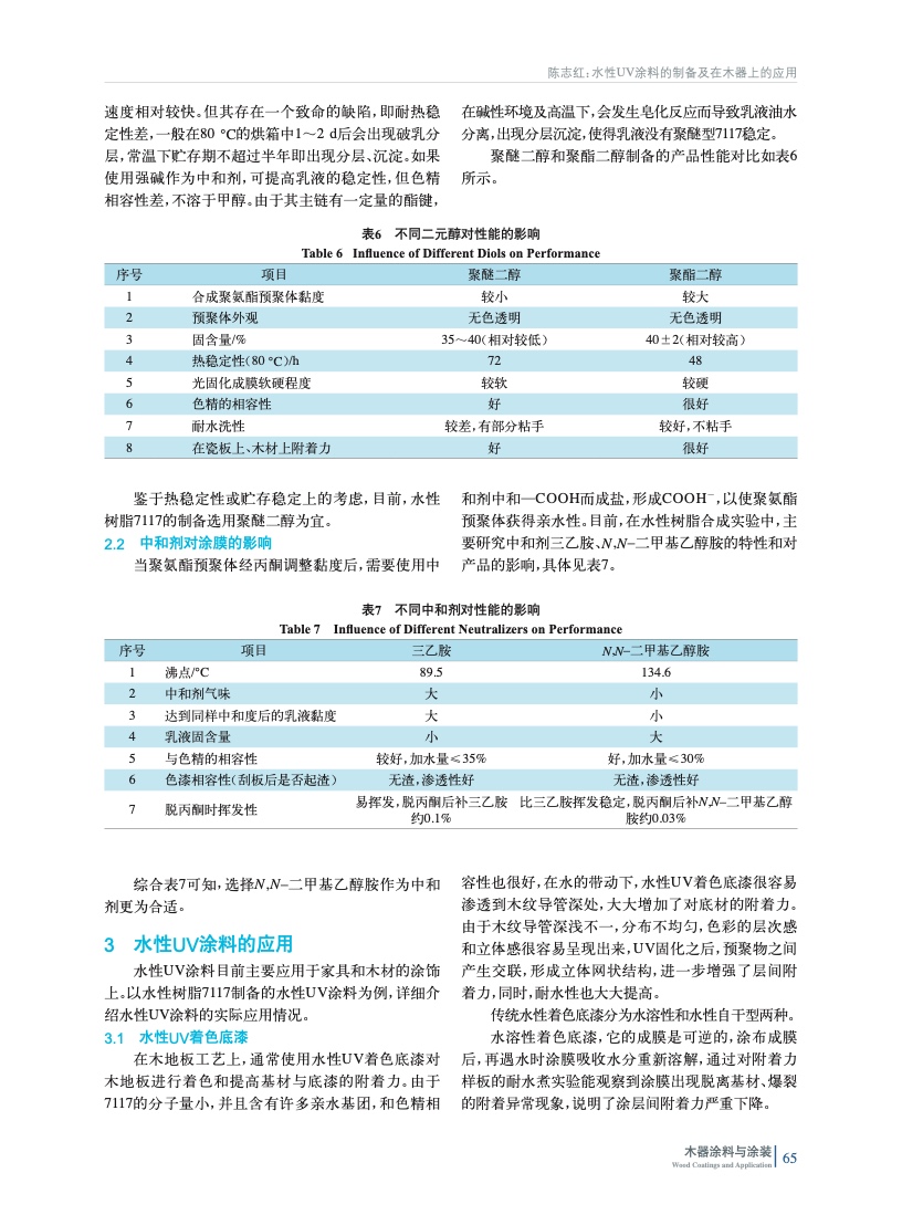 采用平行實驗的方法,采用異佛爾酮二異氰酸酯(IPDI)和聚醚二醇反應,引入—COOH基團,加入胺中和得到水性UV樹脂,并制備水性UV涂料,討論了長鏈二元醇和中和劑的選擇對于產品性能的影響。介紹了水性UV涂料在家具和木材領域應用實例,并給出了常用施工工藝,具有一定實用價值。
