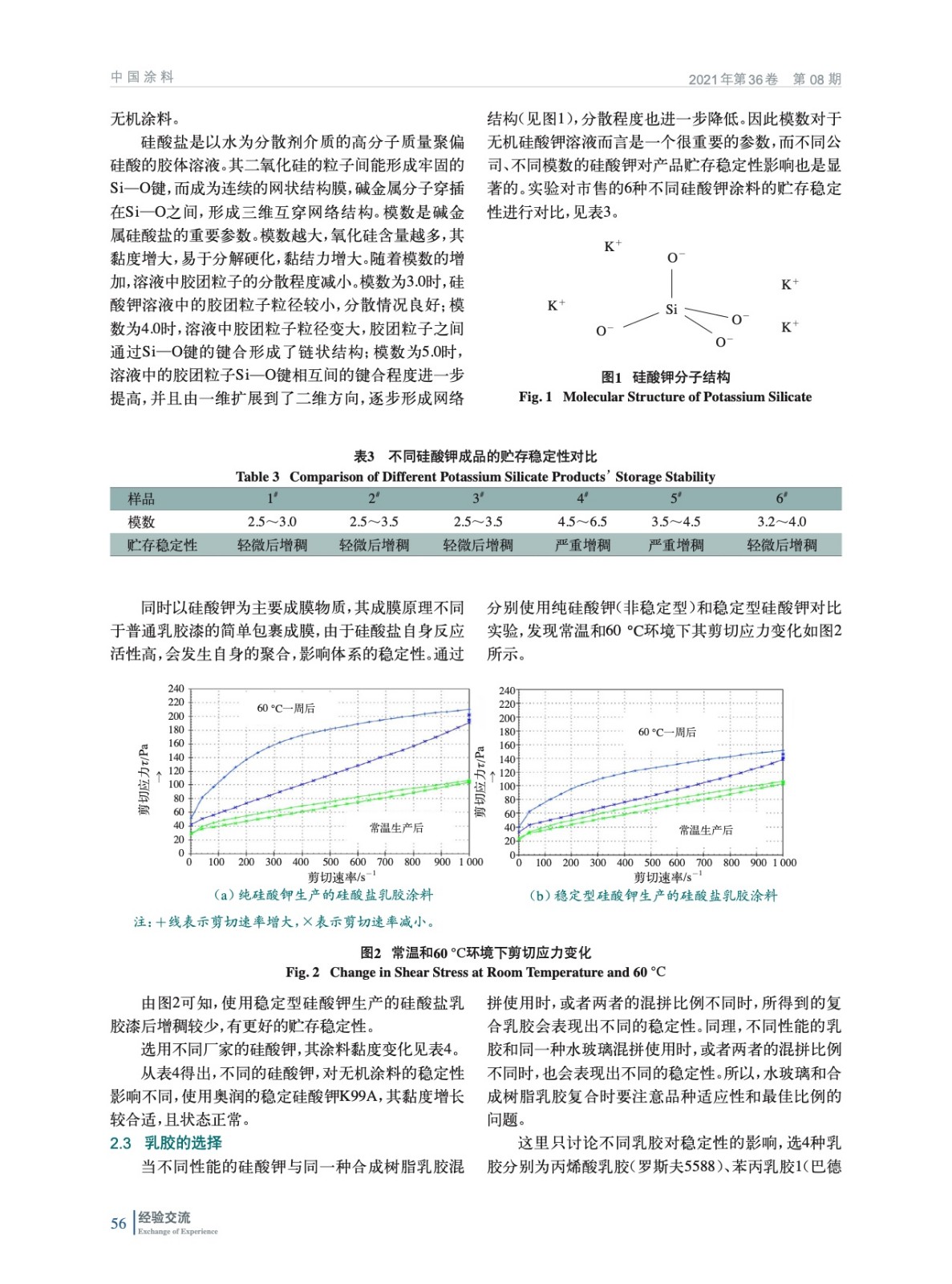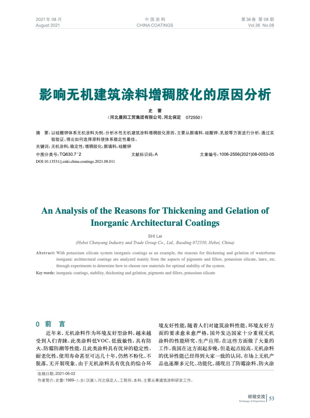 以硅酸鉀體系無機涂料為例,分析水性無機建筑涂料增稠膠化原因,主要從顏填料、硅酸鉀、乳膠等方面進行分析,通過實驗驗證,得出如何選擇原料使體系穩定性最佳。