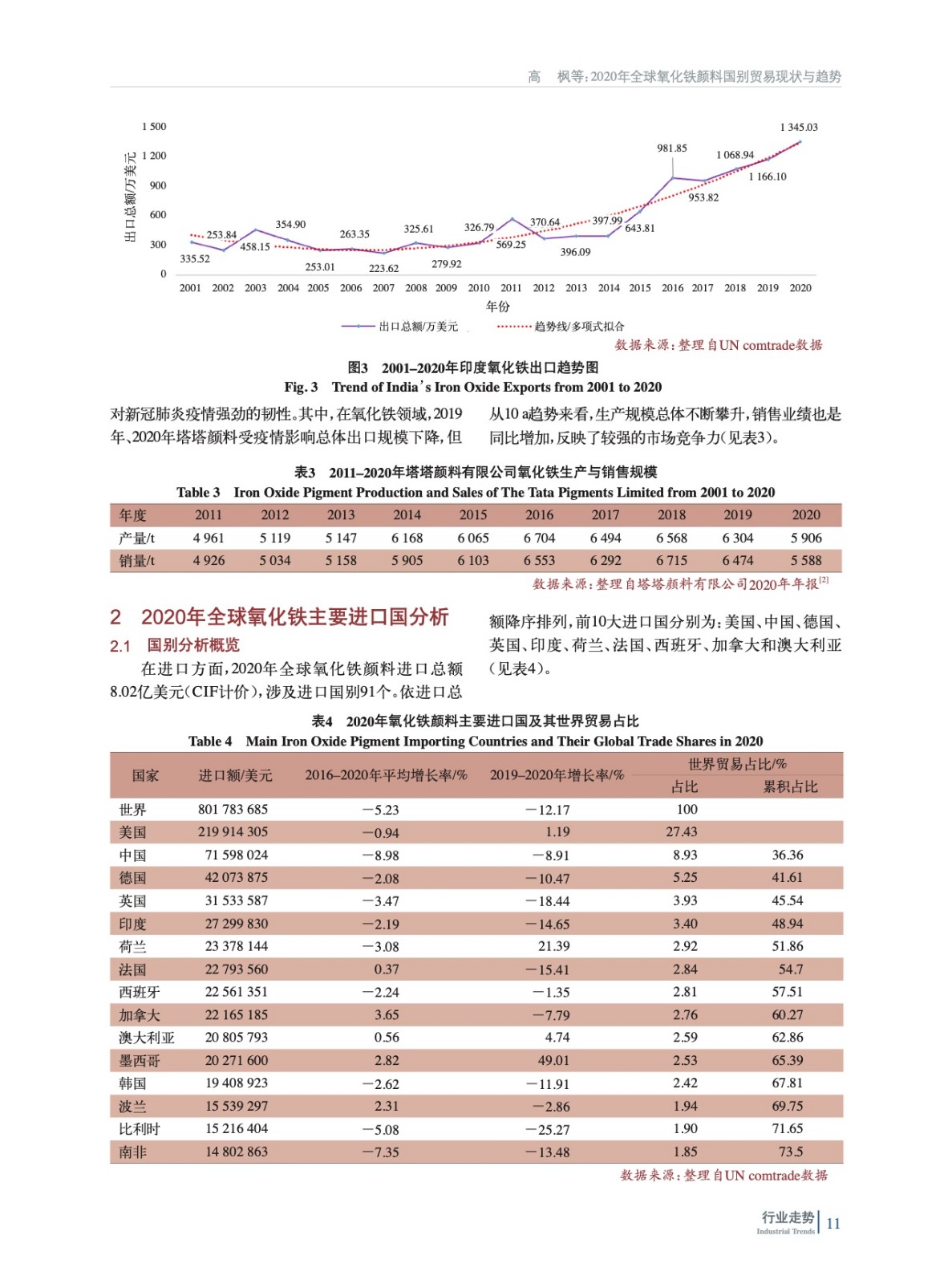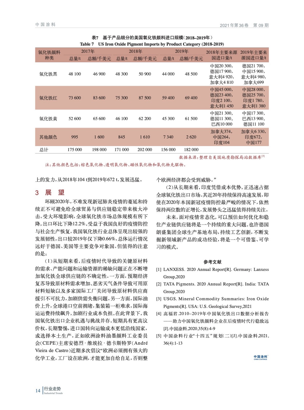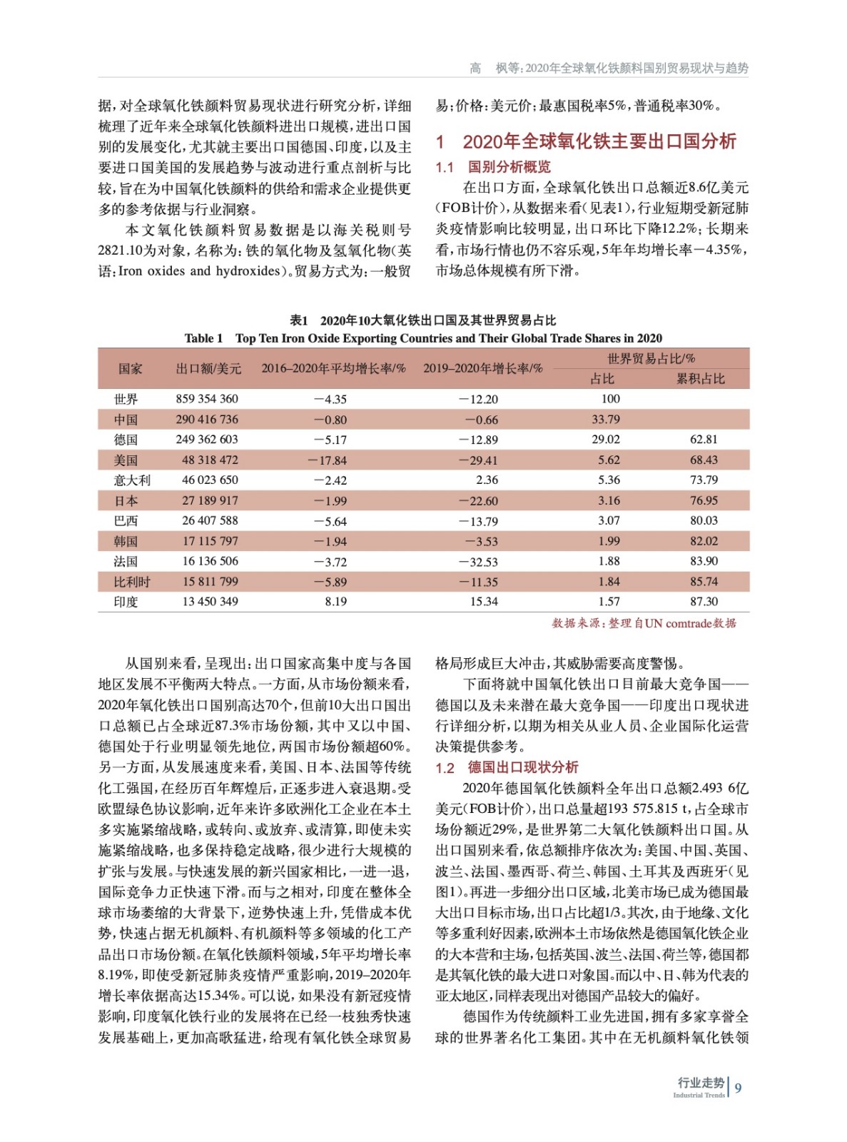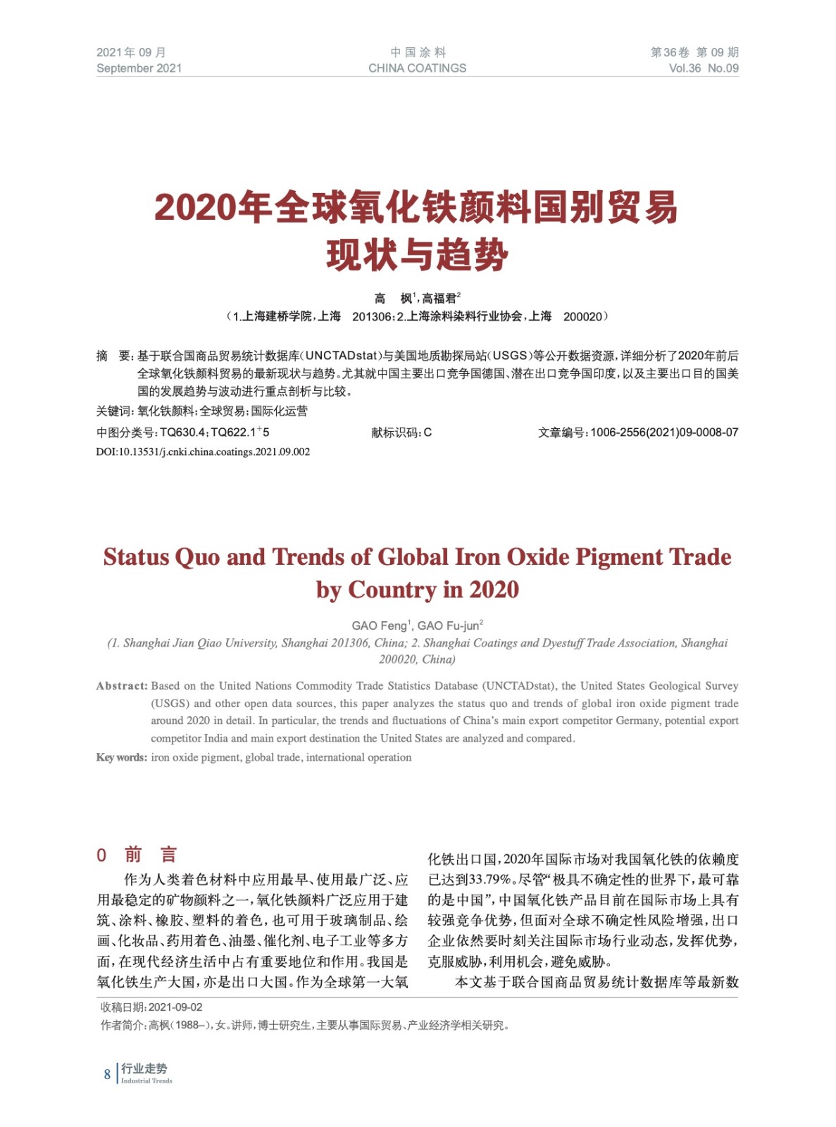摘要:基于聯(lián)合國商品貿(mào)易統(tǒng)計數(shù)據(jù)庫(UNCTADstat)與美國地質勘探局站(USGS)等公開數(shù)據(jù)資源,詳細分析了2020年前后全球氧化鐵顏料貿(mào)易的最新現(xiàn)狀與趨勢。尤其就中國主要出口競爭國德國、潛在出口競爭國印度,以及主要出口目的國美國的發(fā)展趨勢與波動進行重點剖析與比較。