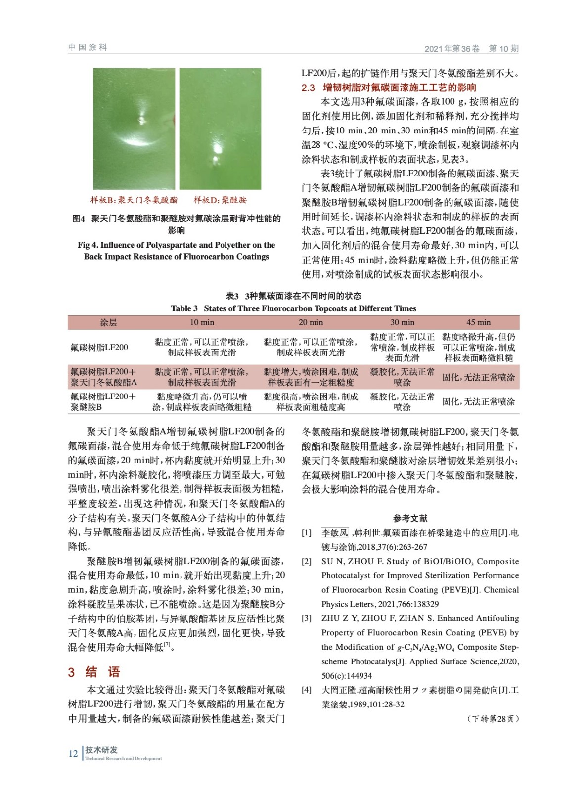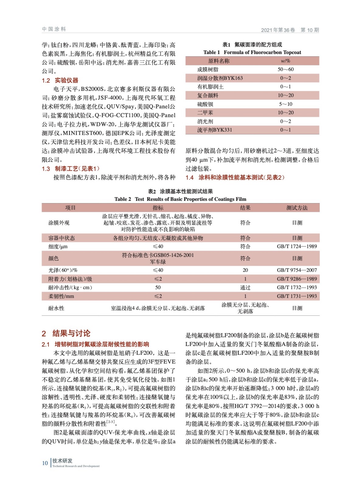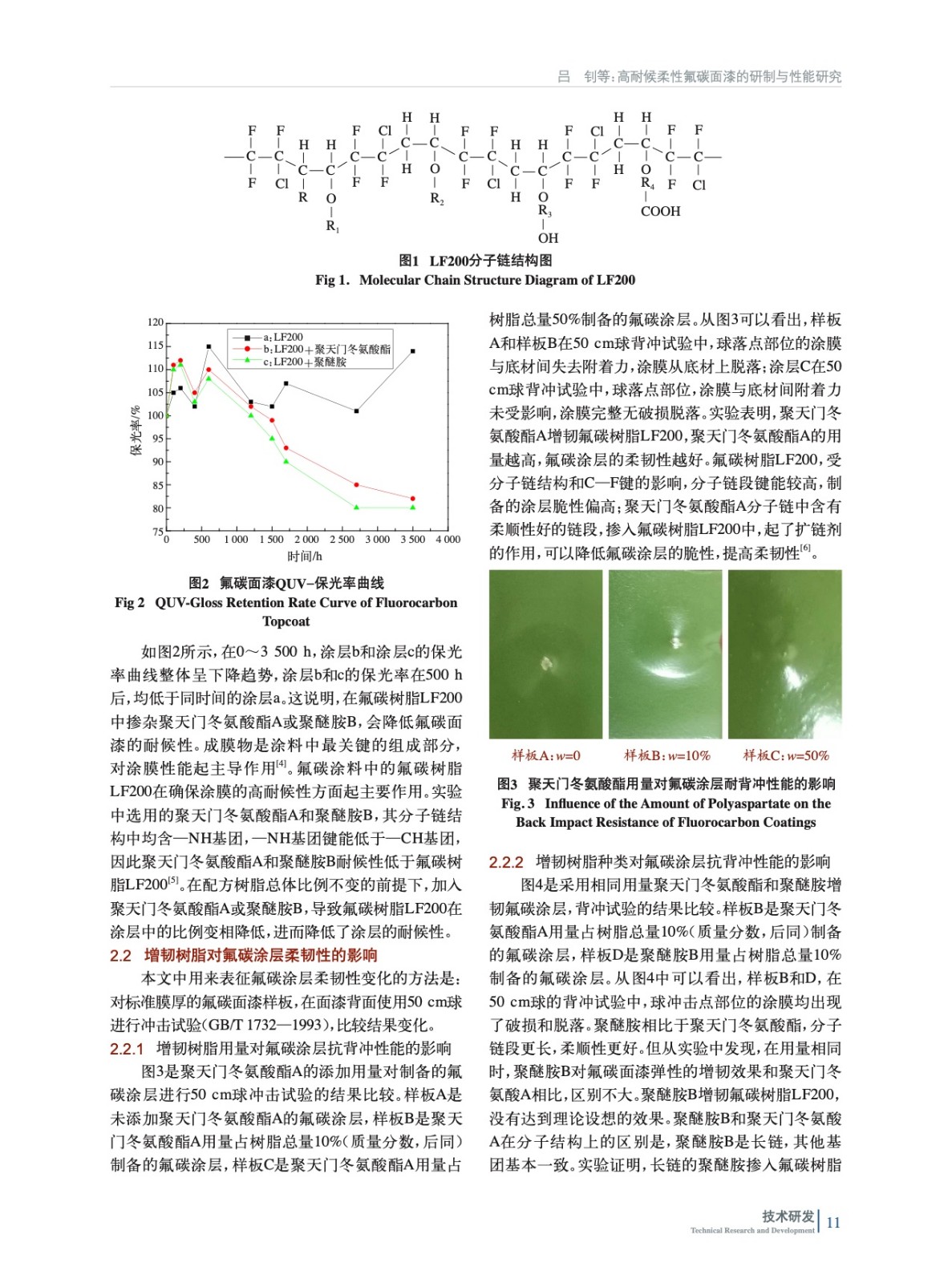 選用多種增韌樹脂,提高氟碳涂層的柔韌性,改善氟碳涂層膜厚較高時脆性過高的問題。研究過程中,分析了增韌樹脂的用量與種類對氟碳涂層柔韌性及耐候性能的影響,并簡述了添加增韌樹脂對氟碳面漆施工的影響。