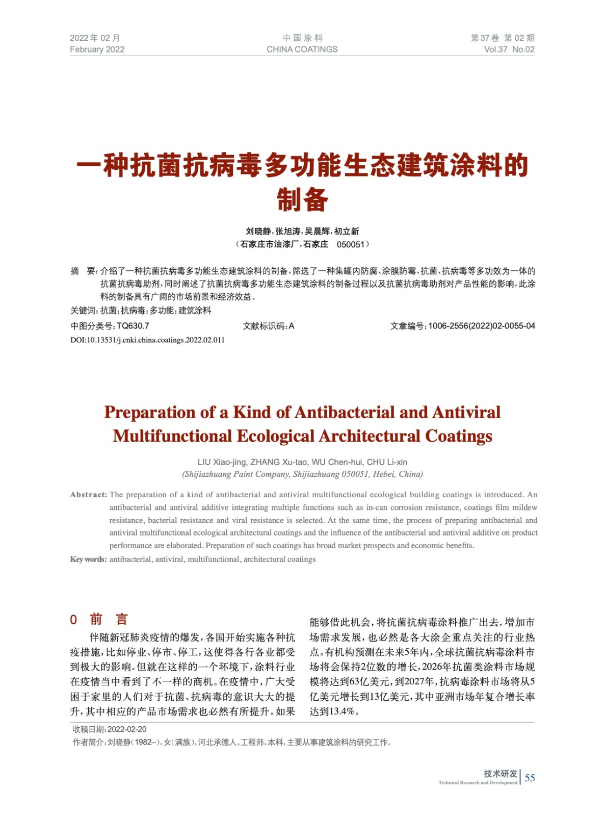介紹了一種抗菌抗病毒多功能生態建筑涂料的制備。篩選了一種集罐內防腐、涂膜防霉、抗菌、抗病毒等多功效為一體的抗菌抗病毒助劑,同時闡述了抗菌抗病毒多功能生態建筑涂料的制備過程以及抗菌抗病毒助劑對產品性能的影響,此涂料的制備具有廣闊的市場前景和經濟效益。