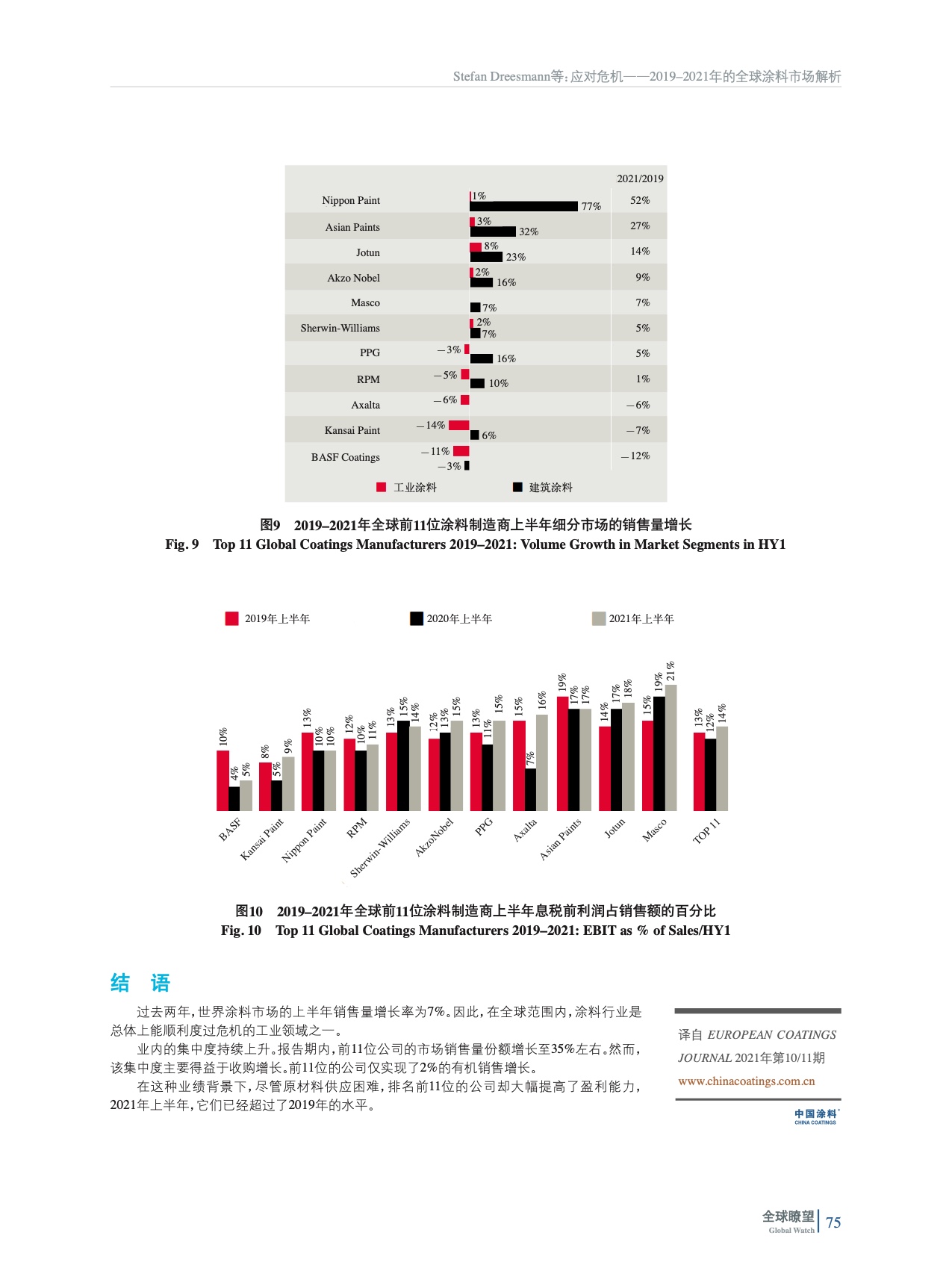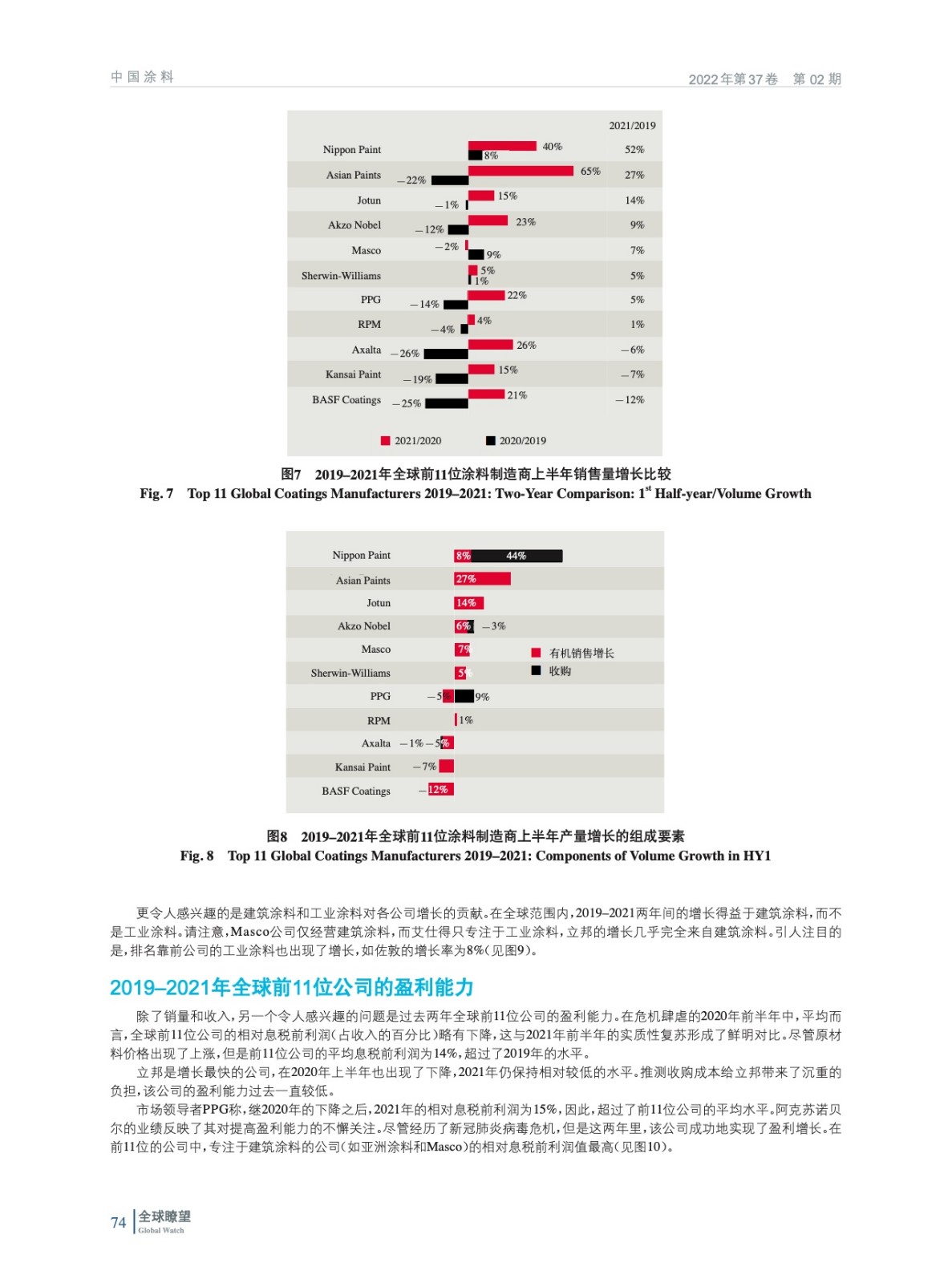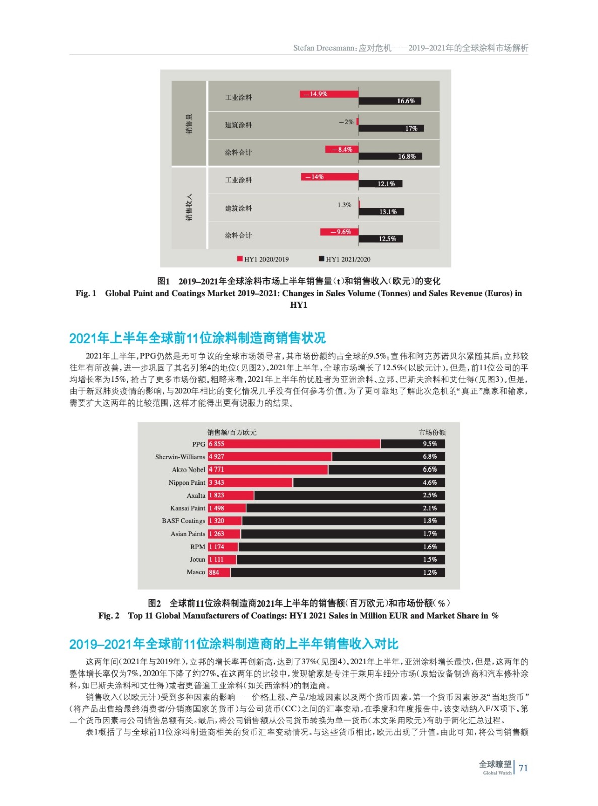 摘要:編者按:過去兩年,在涂料行業(yè)的前11位涂料制造商中,哪些公司能夠最好地應(yīng)對(duì)新冠肺炎疫情危機(jī)?在涂料行業(yè)跨國公司的2021年上半年財(cái)務(wù)報(bào)告中,銷售增長令人眼花繚亂。那么,“一切都好起來了”嗎?本文將進(jìn)一步深入研究這些公司的銷售額、銷售量,分析“有機(jī)銷售增長”和“收購”,以及“建筑涂料”和“工業(yè)涂料”細(xì)分市場的相對(duì)變化。最后,將快速了解這些公司的盈利能力。