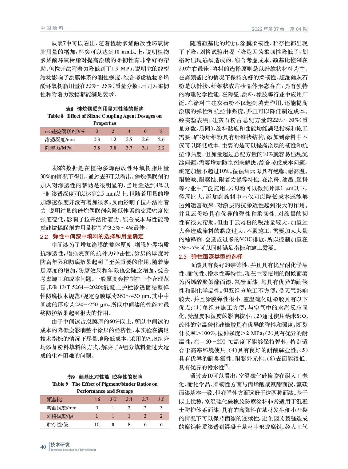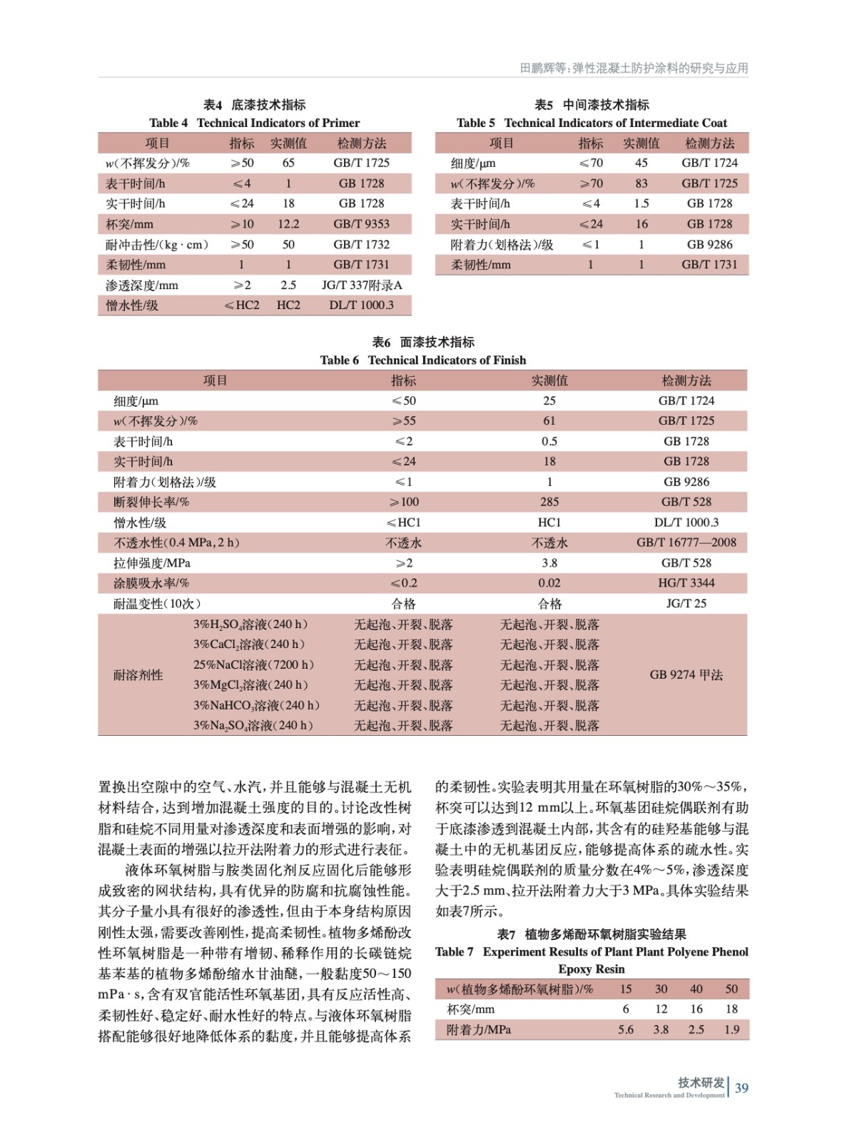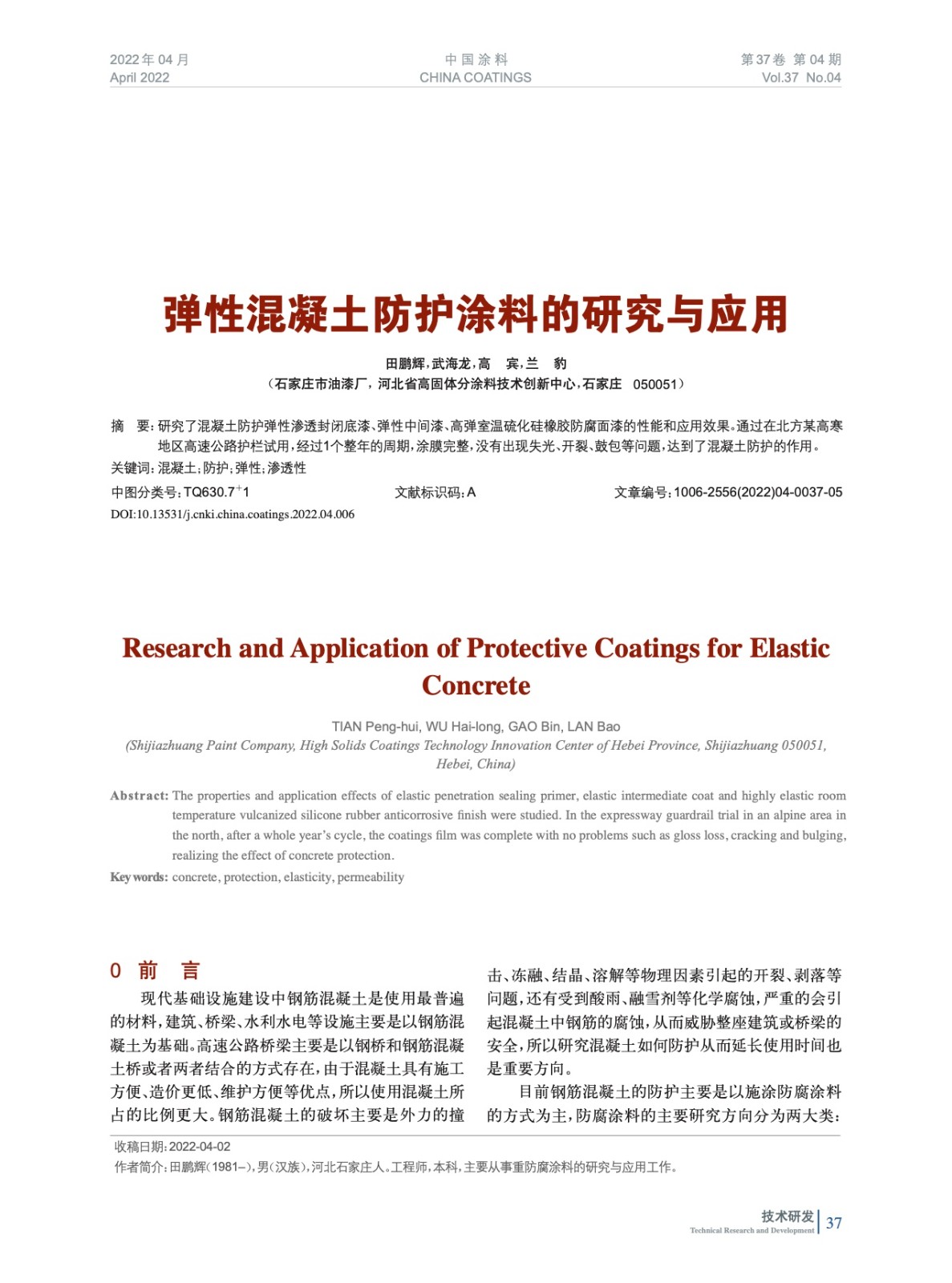研究了混凝土防護彈性滲透封閉底漆、彈性中間漆、高彈室溫硫化硅橡膠防腐面漆的性能和應用效果。通過在北方某高寒地區高速公路護欄試用,經過1個整年的周期,涂膜完整,沒有出現失光、開裂、鼓包等問題,達到了混凝土防護的作用。
