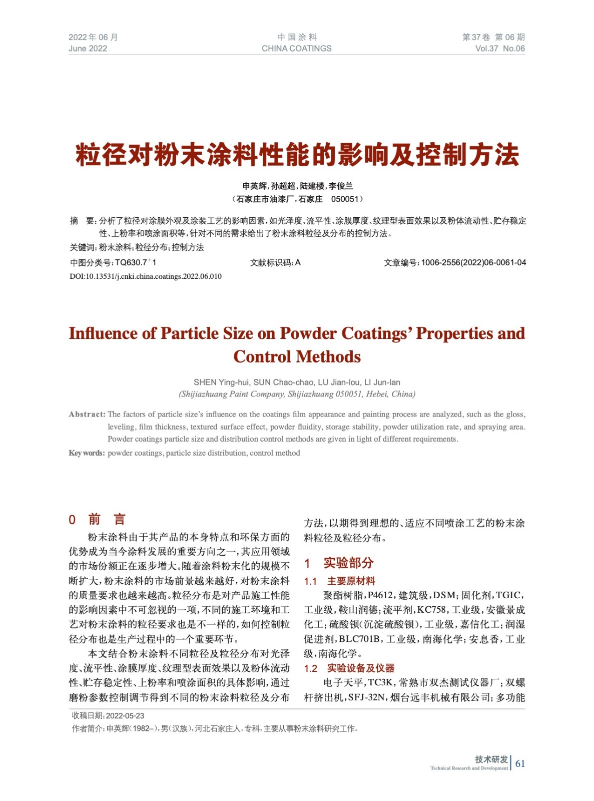 分析了粒徑對涂膜外觀及涂裝工藝的影響因素,如光澤度、流平性、涂膜厚度、紋理型表面效果以及粉體流動性、貯存穩定性、上粉率和噴涂面積等,針對不同的需求給出了粉末涂料粒徑及分布的控制方法。