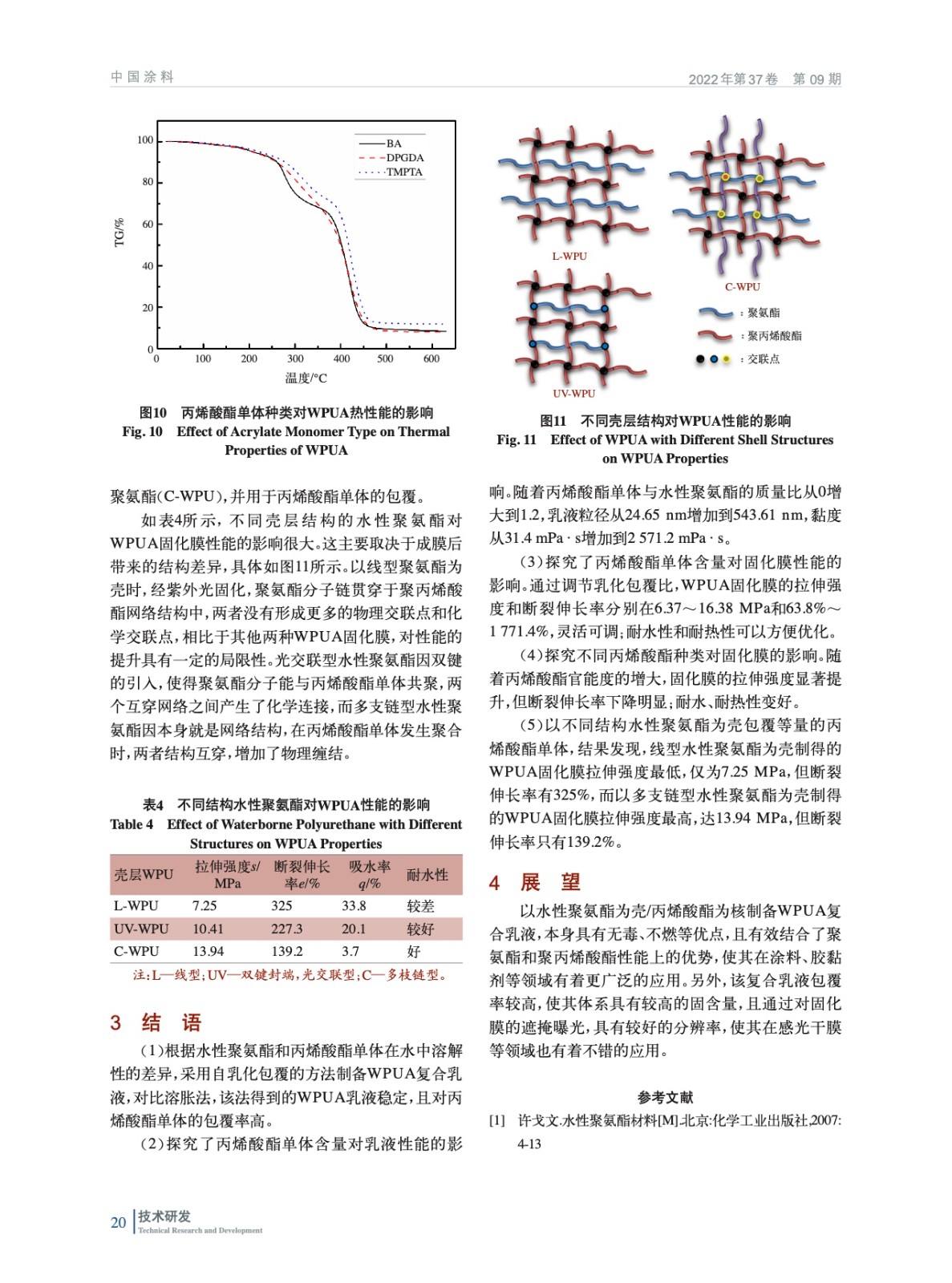 摘要:以聚四氫呋喃二醇、甲苯二異氰酸酯、2,2–雙(羥甲基)丙酸和1,4–丁二醇為主要原料,經(jīng)逐步聚合制得水性聚氨酯,并利用紅外光譜對(duì)其結(jié)構(gòu)進(jìn)行表征。以水性聚氨酯自乳化包覆丙烯酸酯單體,制備系列水性聚氨酯/丙烯酸酯核殼復(fù)合乳液(WPUA),并探究丙烯酸酯單體含量、種類(lèi)及殼層水性聚氨酯結(jié)構(gòu)對(duì)復(fù)合乳液和固化膜性能的影響。