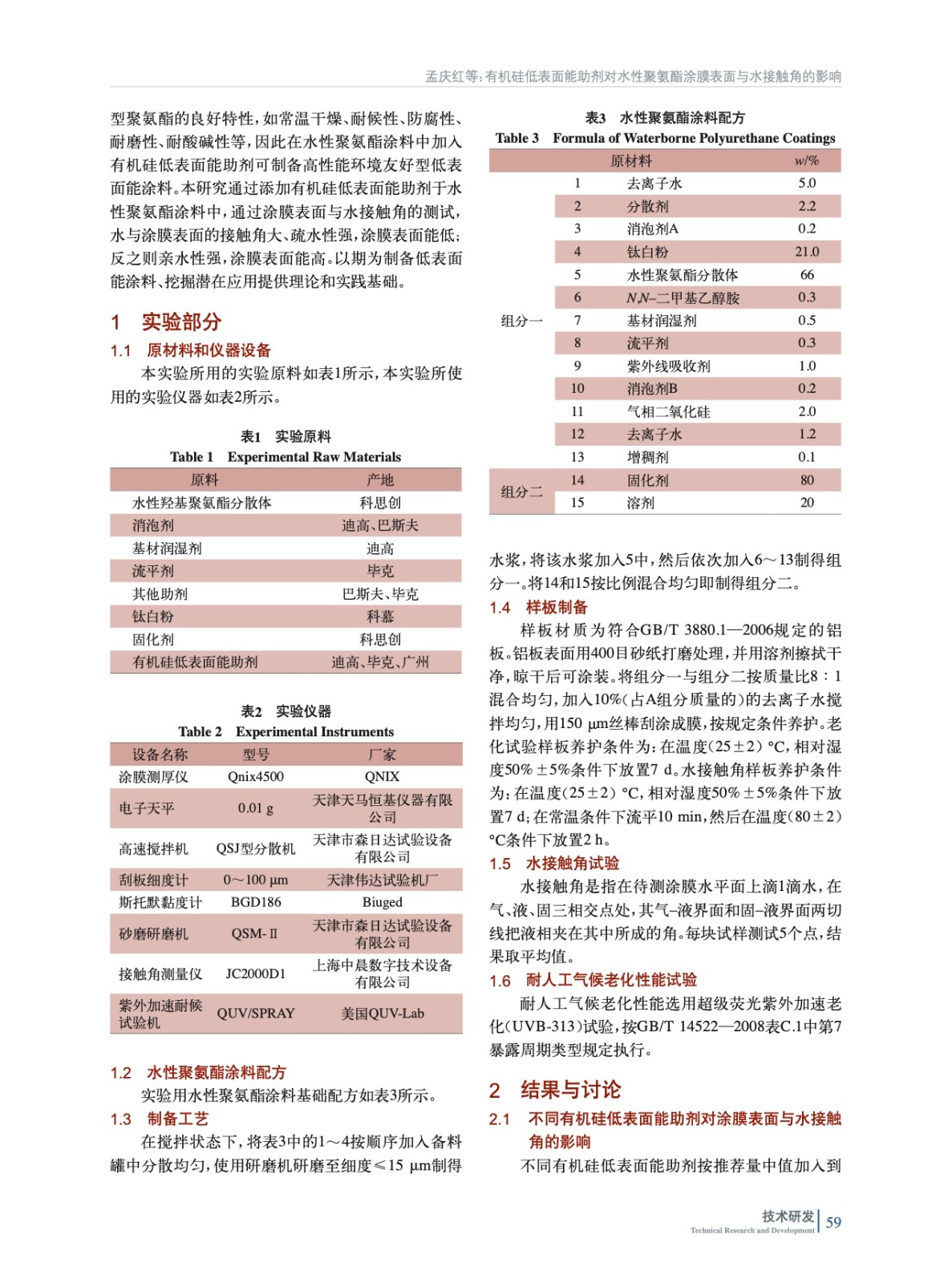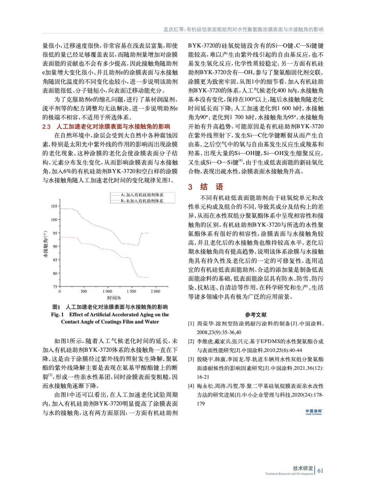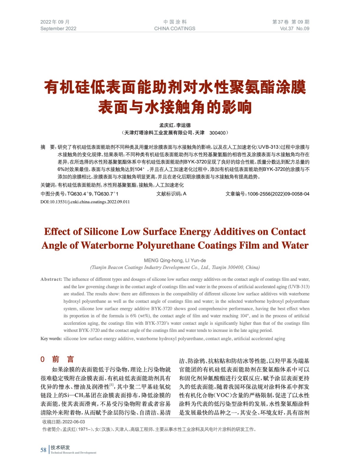 摘要:研究了有機硅低表面能助劑不同種類及用量對涂膜表面與水接觸角的影響,以及在人工加速老化過程中涂膜與水接觸角的變化規(guī)律。結果表明:在所選擇的水性羥基聚氨酯體系中有機硅低表面能助劑BYK-3720呈現(xiàn)了良好的綜合性能,質量分數(shù)達到配方總量的6%時效果最佳,表面與水接觸角達到104°,并且在人工加速老化過程中,涂膜表面與水接觸角明顯更高,并且在老化后期涂膜表面與水接觸角有提高趨勢。