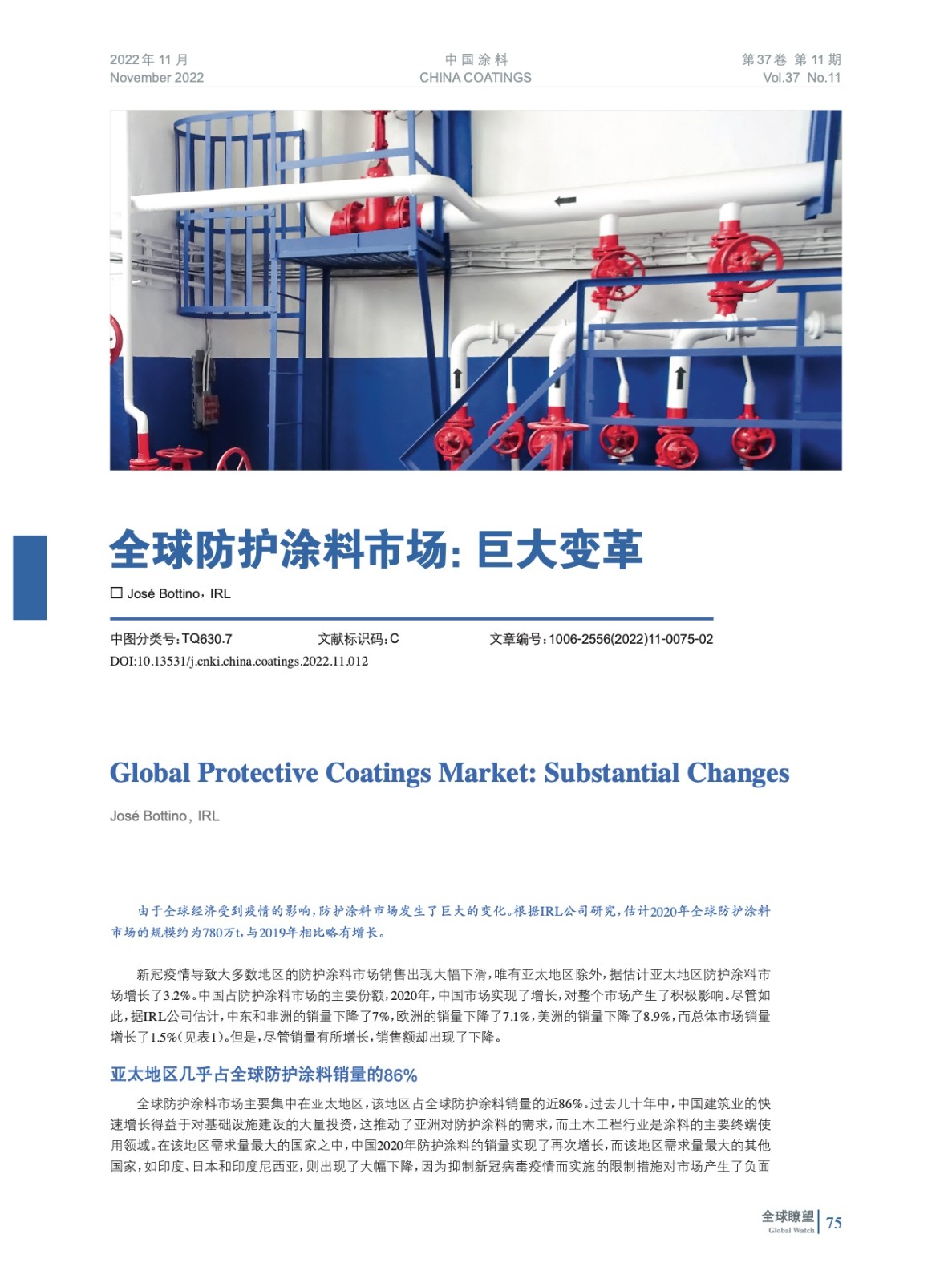 編者按:由于全球經濟受到疫情的影響,防護涂料市場發生了巨大的變化。根據IRL公司研究,估計2020年全球防護涂料市場的規模約為780萬t,與2019年相比略有增長。