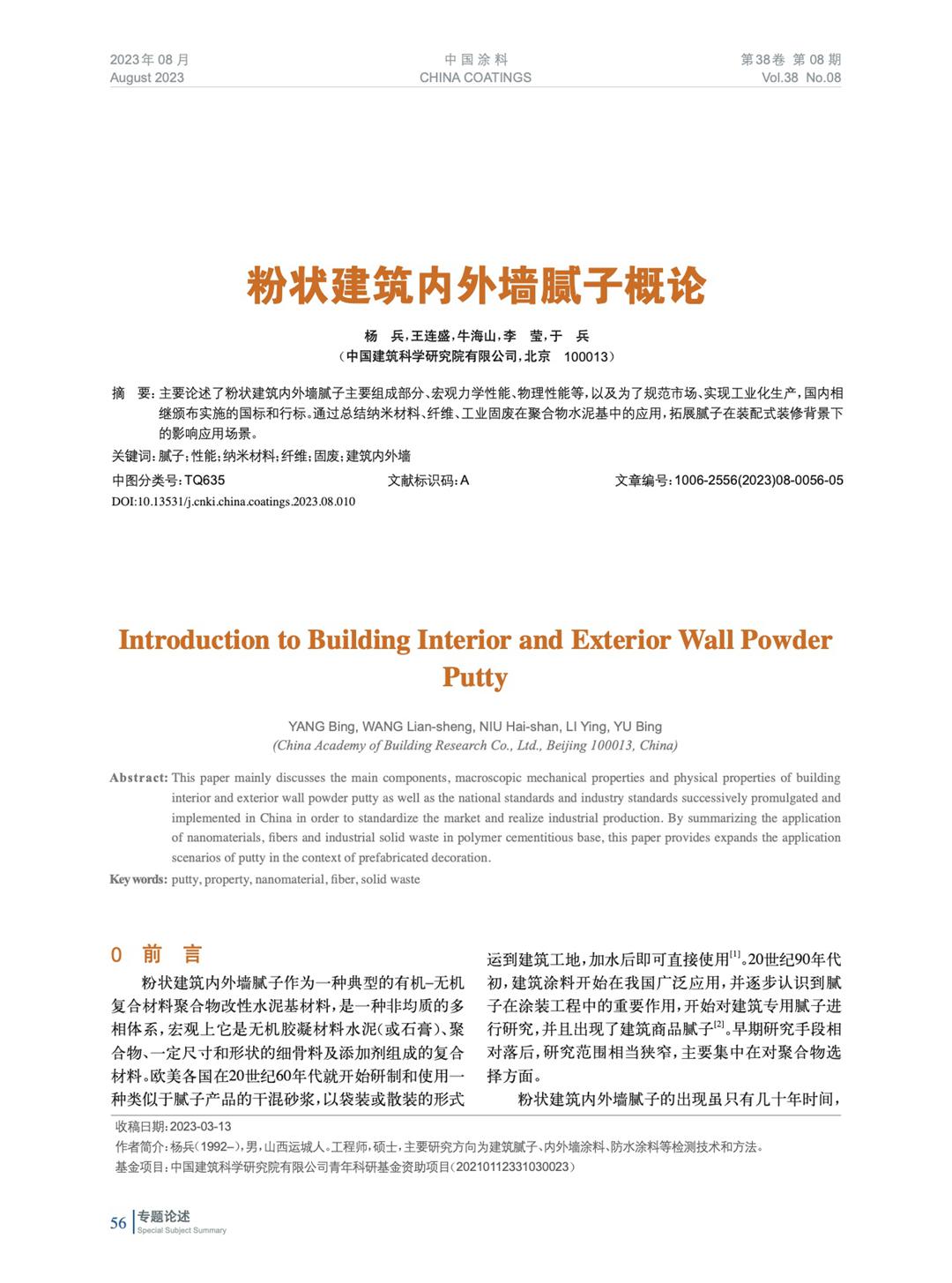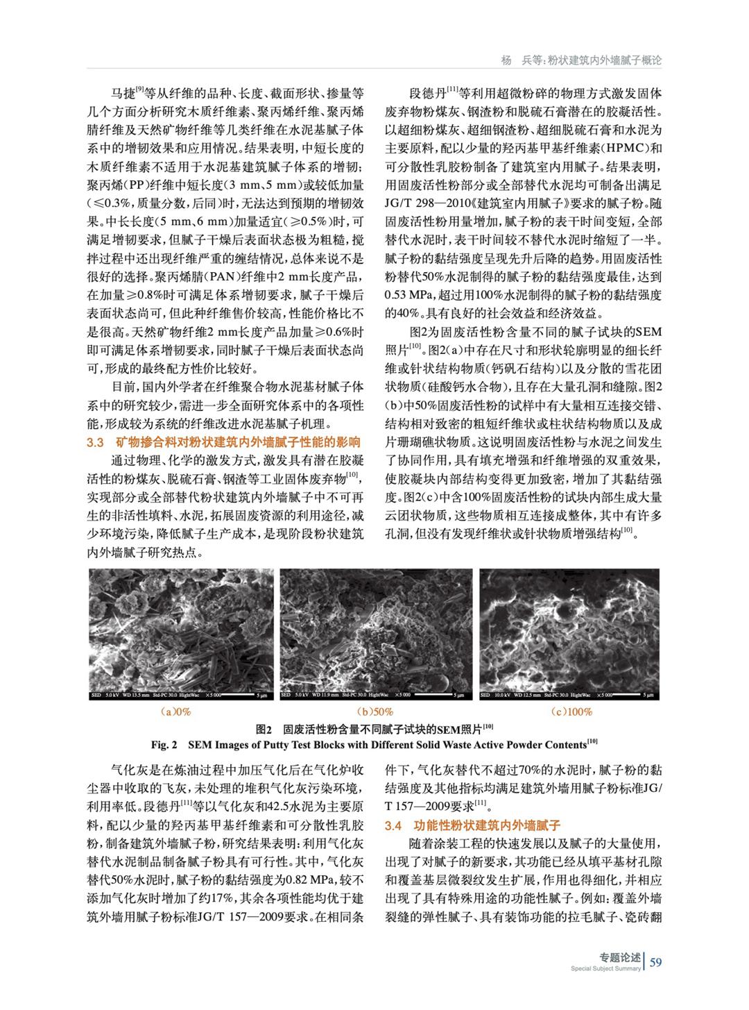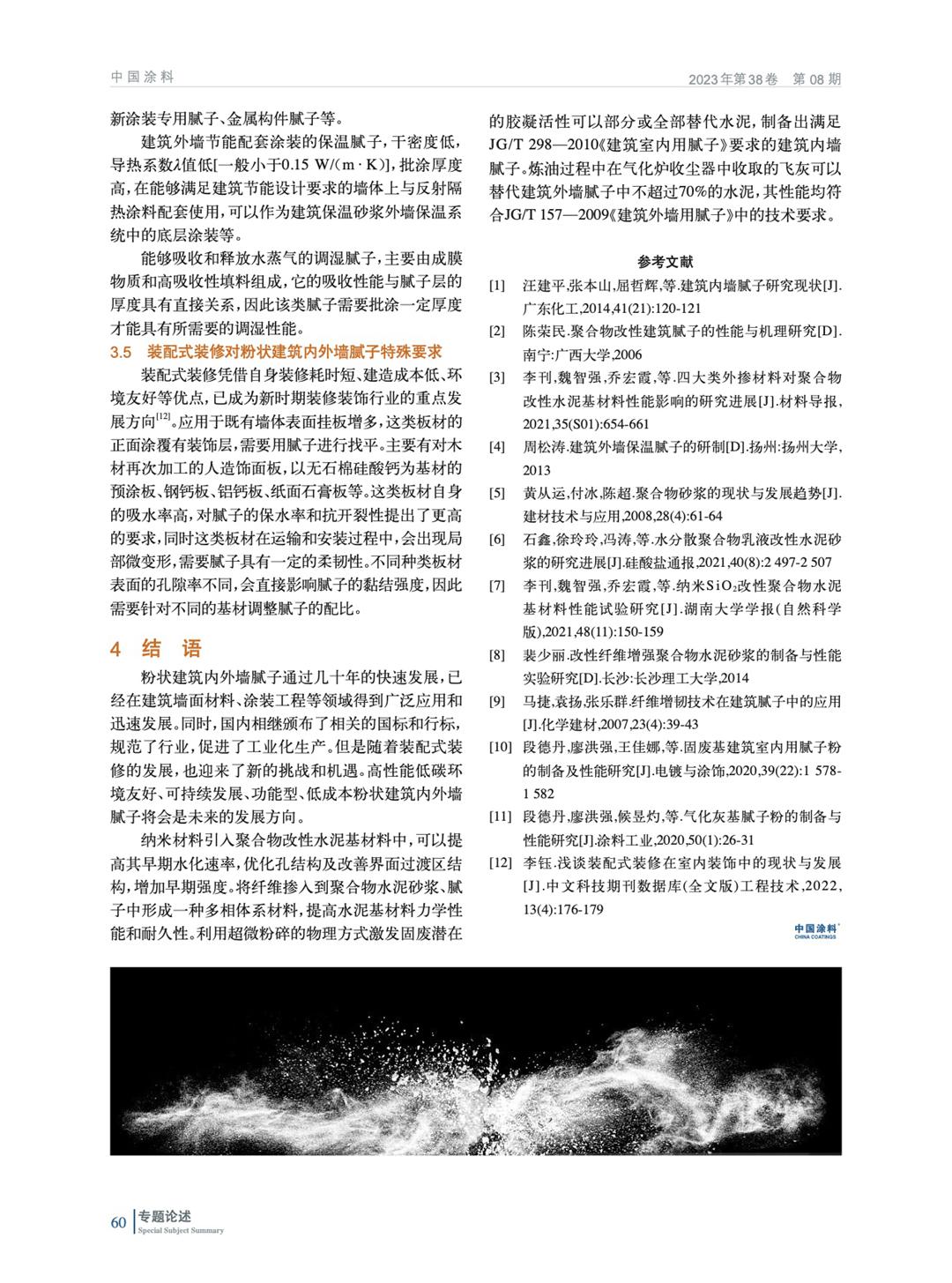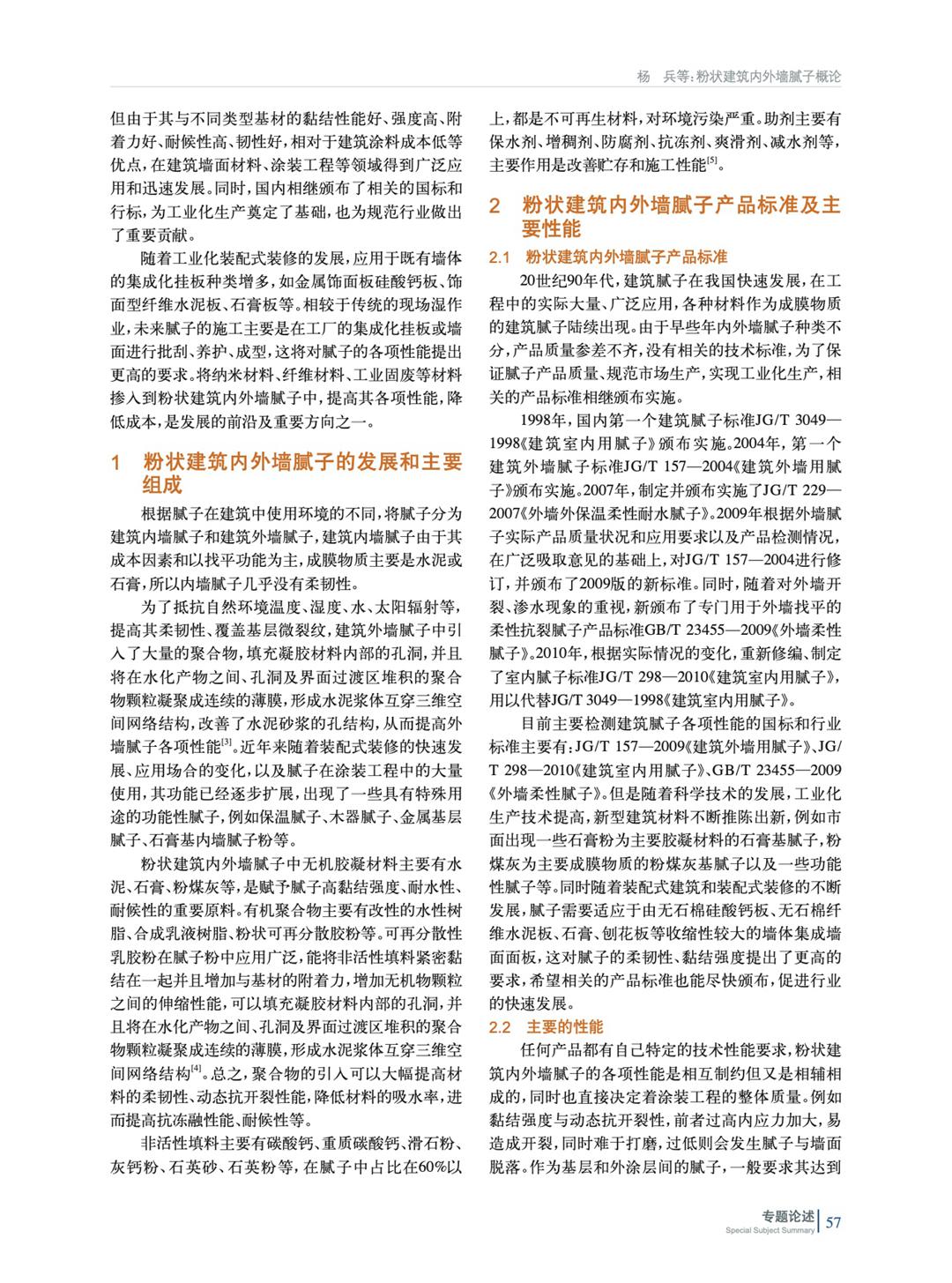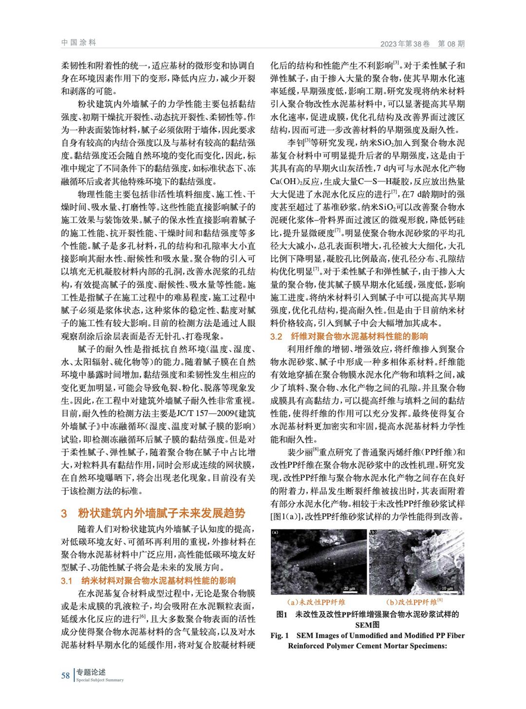 主要論述了粉狀建筑內外墻膩子主要組成部分、宏觀力學性能、物理性能等,以及為了規范市場、實現工業化生產,國內相繼頒布實施的國標和行標。通過總結納米材料、纖維、工業固廢在聚合物水泥基中的應用,拓展膩子在裝配式裝修背景下的影響應用場景。
