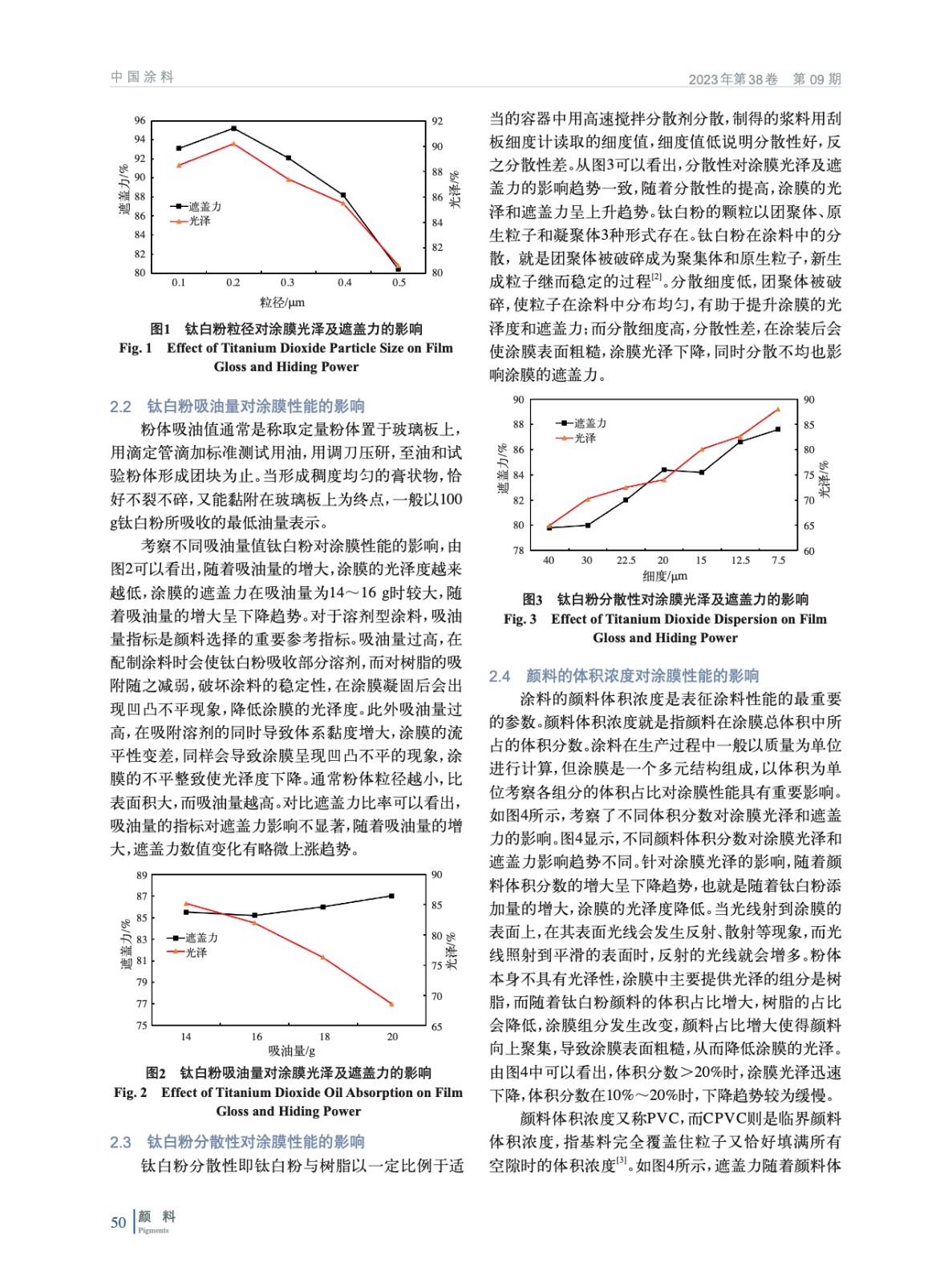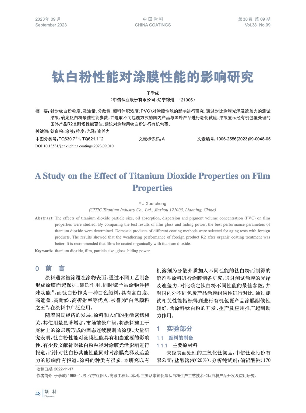 針對鈦白粉粒度、吸油量、分散性、顏料體積濃度(PVC)對涂膜性能的影響進行研究,通過對比涂膜光澤及遮蓋力的測試結果,確定鈦白粉最佳性能參數,并選取不同包覆方式的國內產品與國外產品進行老化試驗,結果顯示經有機包覆處理的國外產品R2其耐候性能更佳,建議對涂膜用鈦白粉進行有機包覆。