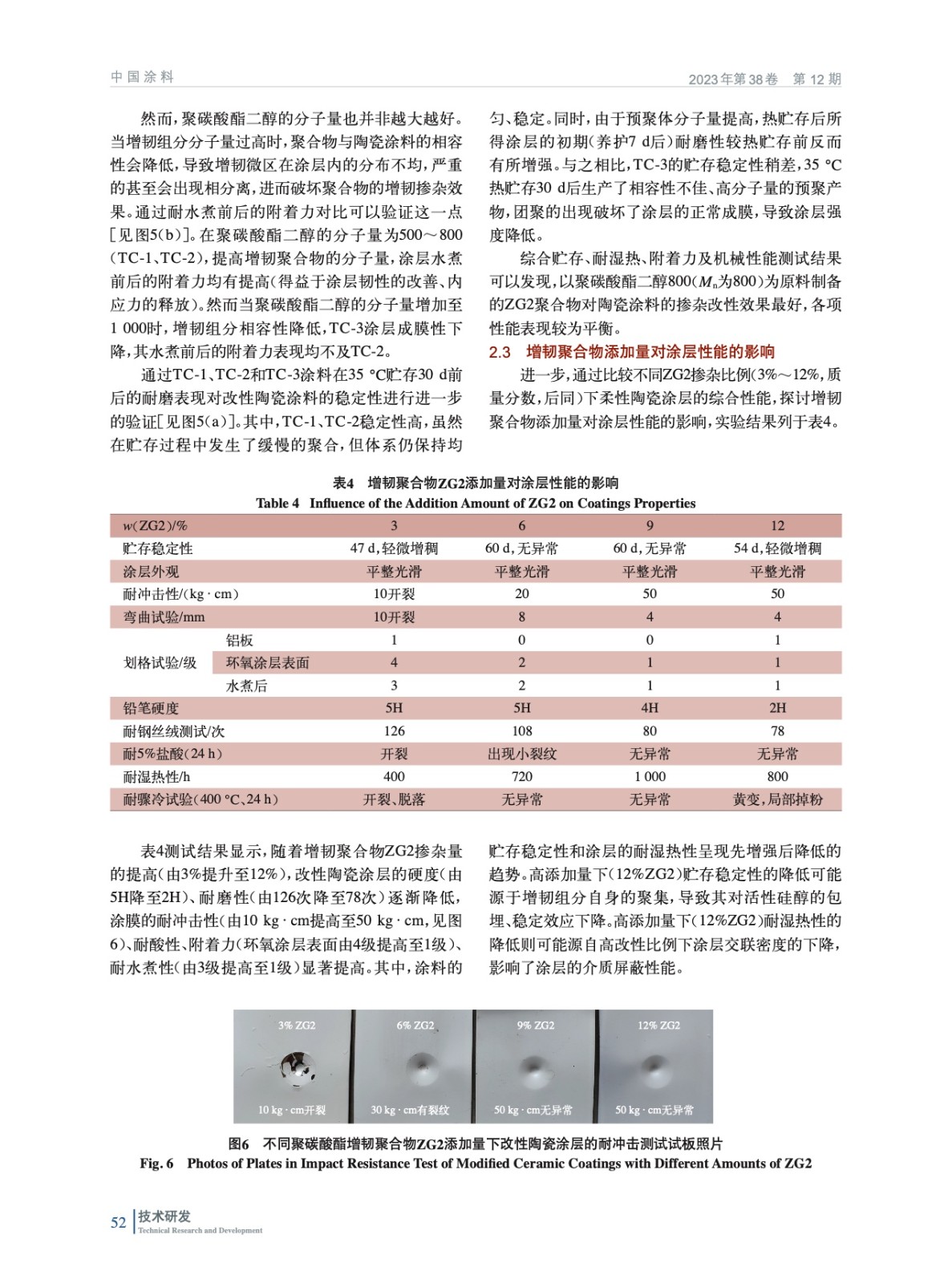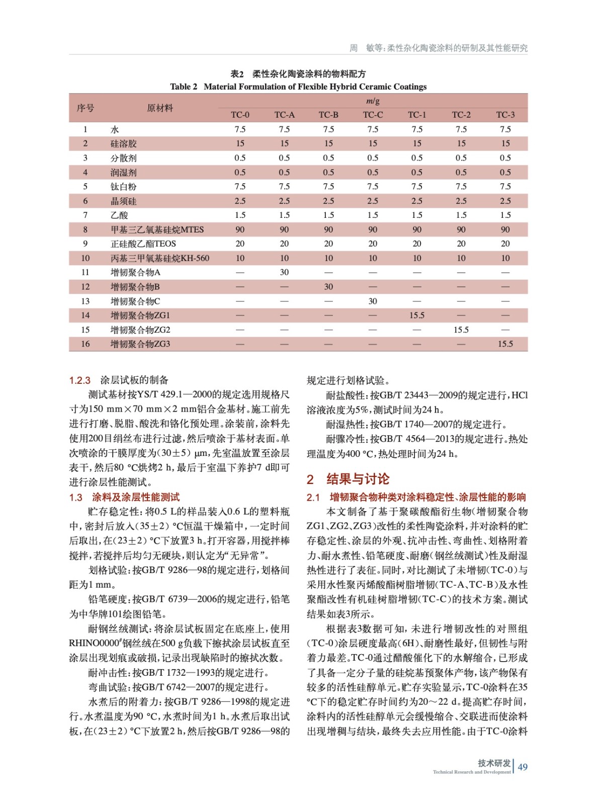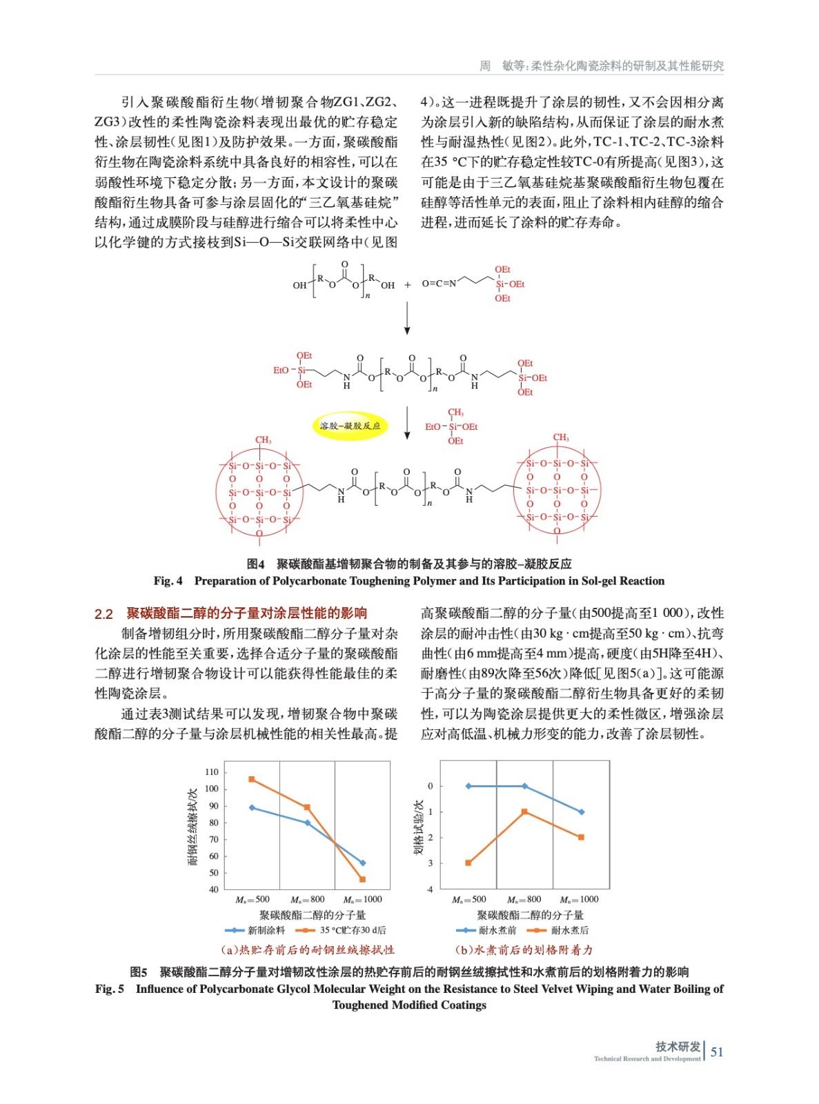 摘要:以聚碳酸酯二醇和γ–異氰酸酯基丙基三乙氧基硅烷為原料,制備了具有良好硅烷相容性與貯存穩(wěn)定性的活性增韌聚合物ZG2,并將其應(yīng)用于陶瓷涂料的柔性改性。實(shí)驗(yàn)結(jié)果顯示,聚碳酸酯基增韌聚合物ZG2的摻雜,一方面可以包埋涂料中的活性硅醇,延長(zhǎng)涂料的貯存周期;另一方面可以充當(dāng)涂層中的柔性緩沖區(qū),改善因收縮應(yīng)力而產(chǎn)生的涂層開(kāi)裂、附著力低等問(wèn)題。此外,ZG2還可以參與陶瓷涂料的交聯(lián)進(jìn)程,提升涂層的腐蝕介質(zhì)屏蔽性。當(dāng)ZG2的摻雜質(zhì)量分?jǐn)?shù)為9%時(shí),所得改性雜化陶瓷涂料的貯存穩(wěn)定性、熱穩(wěn)定性、機(jī)械強(qiáng)度及綜合防護(hù)性能最優(yōu),具備市場(chǎng)化推廣潛力。