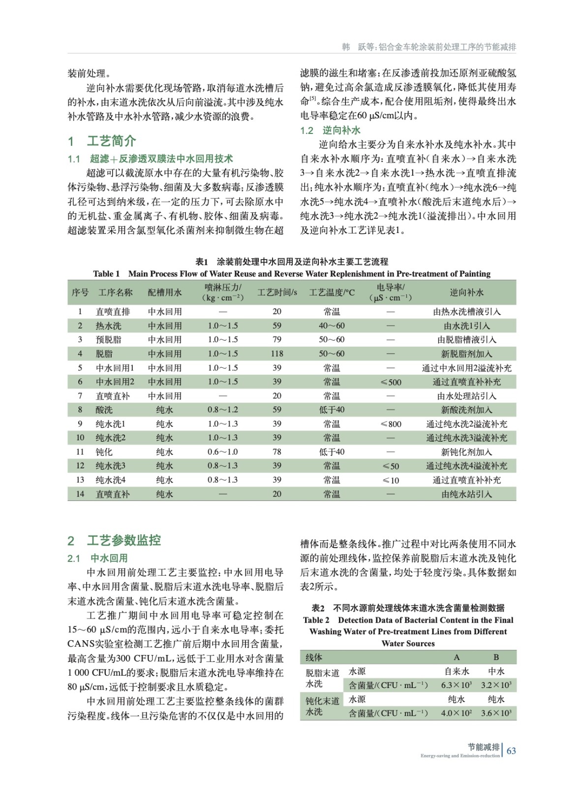 摘要:為提高水資源利用效率,達(dá)到節(jié)能降耗的目的,對鋁合金車輪前處理進(jìn)行中水回用及逆向補(bǔ)水可行性研究。優(yōu)化補(bǔ)水管路,嚴(yán)格監(jiān)控水洗槽電導(dǎo)率及末道水洗菌群污染程度;對鋁合金車輪涂膜性能(附著力、硬度、耐碎石沖擊、耐CASS試驗(yàn)、耐鹽霧性、耐絲狀腐蝕性、耐水性、耐濕性及耐洗滌劑)進(jìn)行測試。結(jié)果標(biāo)明:涂裝前處理中水回用及逆向補(bǔ)水工藝穩(wěn)定,水洗槽電導(dǎo)率及末道水洗含菌量均滿足前處理工藝指標(biāo)要求,涂膜性能合格。
