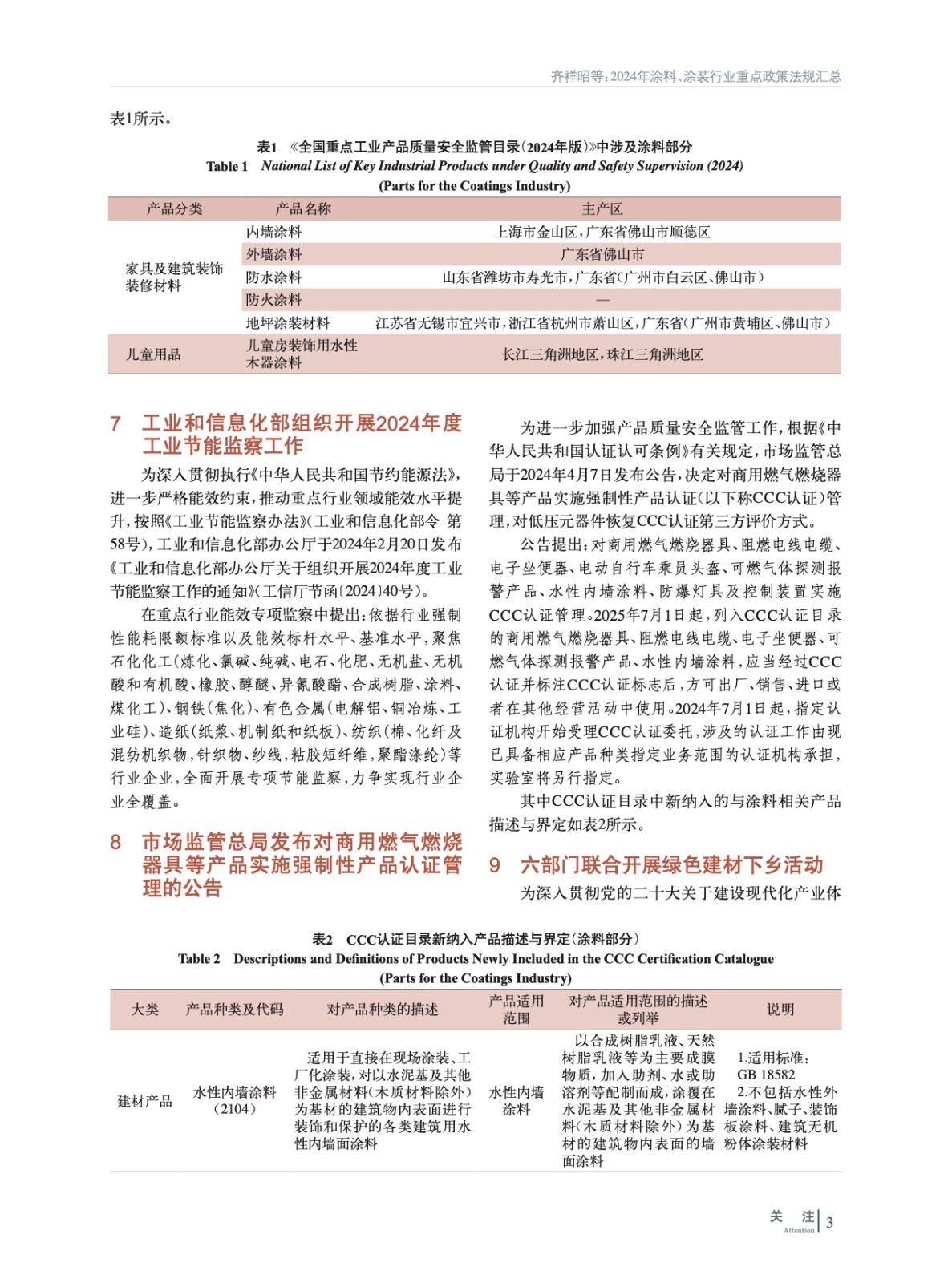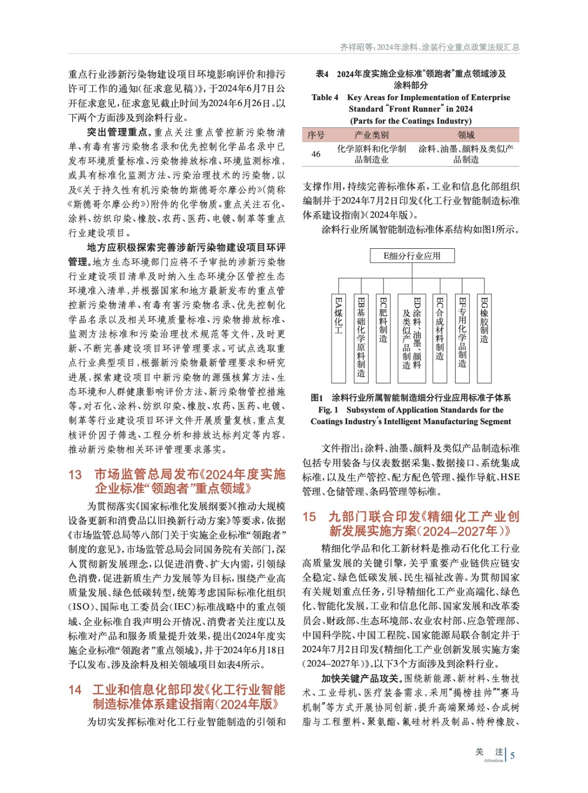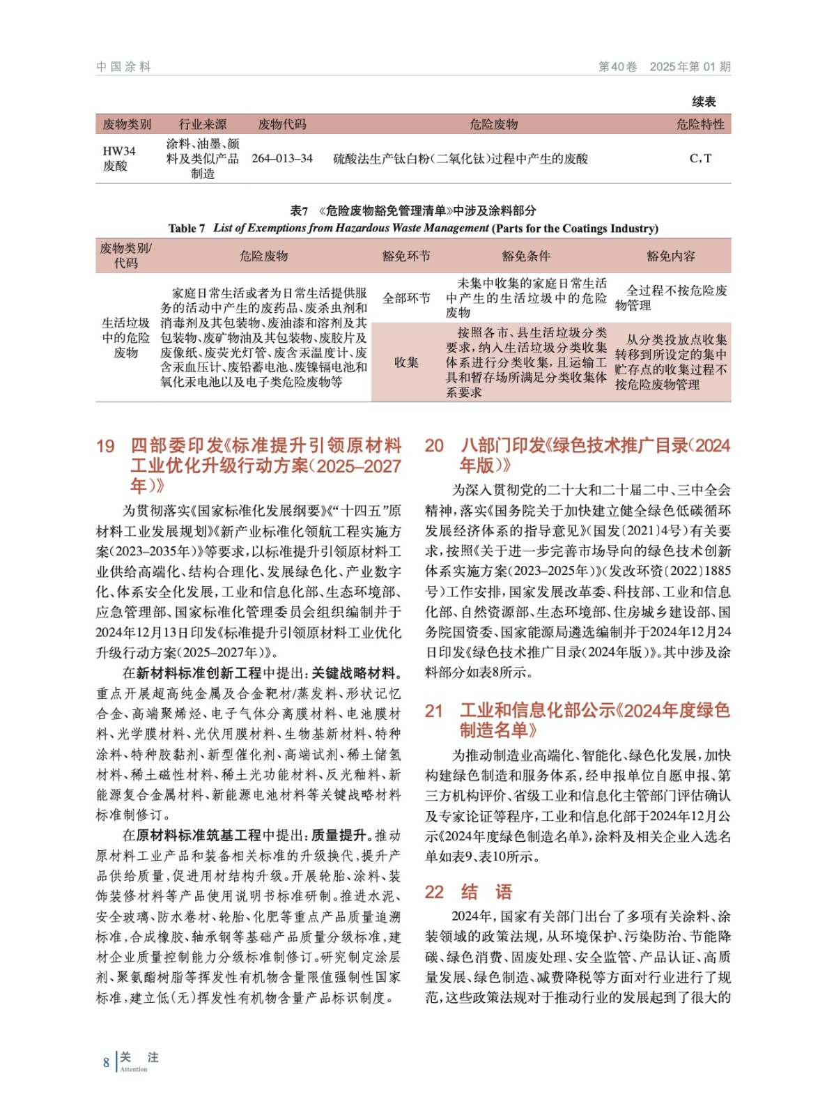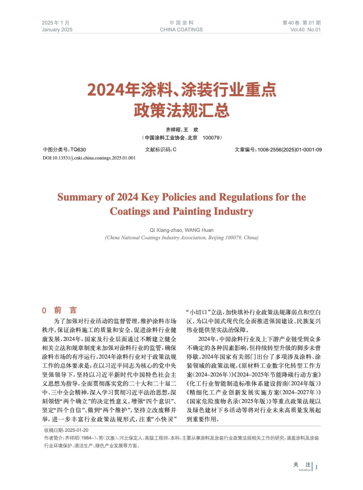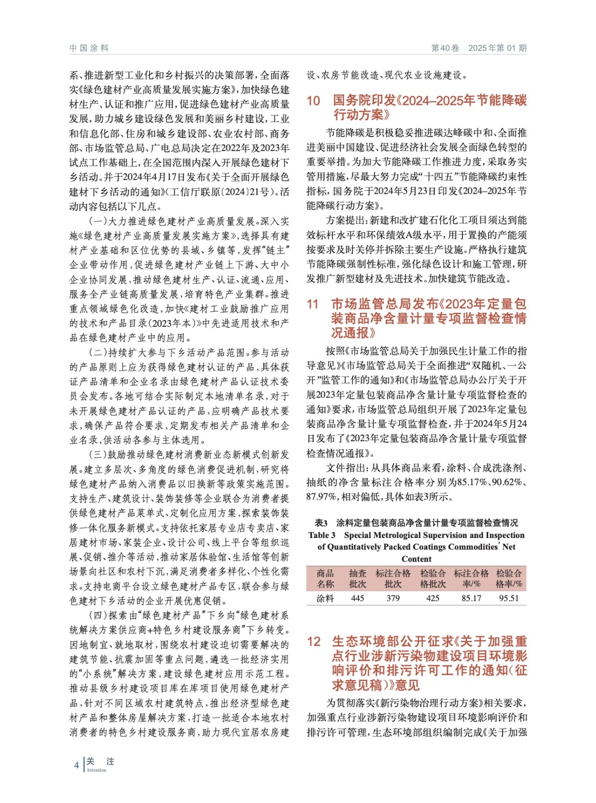摘要:編者按:2024年,中國涂料行業(yè)及上下游產(chǎn)業(yè)鏈?zhǔn)艿奖姸嗖淮_定的各種因素影響,但持續(xù)轉(zhuǎn)型升級的腳步未曾停歇。2024年國家有關(guān)部門出臺了多項涉及涂料、涂裝領(lǐng)域的政策法規(guī),《原材料工業(yè)數(shù)字化轉(zhuǎn)型工作方案(2024–2026年)》《2024–2025年節(jié)能降碳行動方案》《化工行業(yè)智能制造標(biāo)準(zhǔn)體系建設(shè)指南(2024年版)》《精細(xì)化工產(chǎn)業(yè)創(chuàng)新發(fā)展實施方案(2024–2027年)》《國家危險廢物名錄(2025年版)》等重點政策法規(guī)以及綠色建材下鄉(xiāng)活動等將對行業(yè)未來高質(zhì)量發(fā)展起到重要作用。