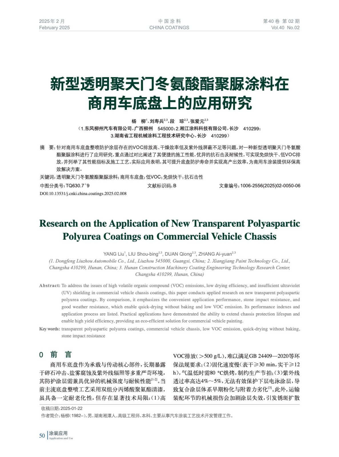 摘要:針對商用車底盤整噴防護涂層存在的VOC排放高、干燥效率低及紫外線屏蔽不足等問題,對一種新型透明聚天門冬氨酸酯聚脲涂料進行了應(yīng)用研究,重點通過對比闡述了其便捷的施工性能,優(yōu)異的抗石擊及耐候性,可實現(xiàn)免烘快干、低VOC排放,并列舉了其性能指標及施工工藝。實際應(yīng)用表明,其可提升底盤防護壽命并實現(xiàn)高產(chǎn)出效率,為商用車涂裝提供環(huán)保高效解決方案。