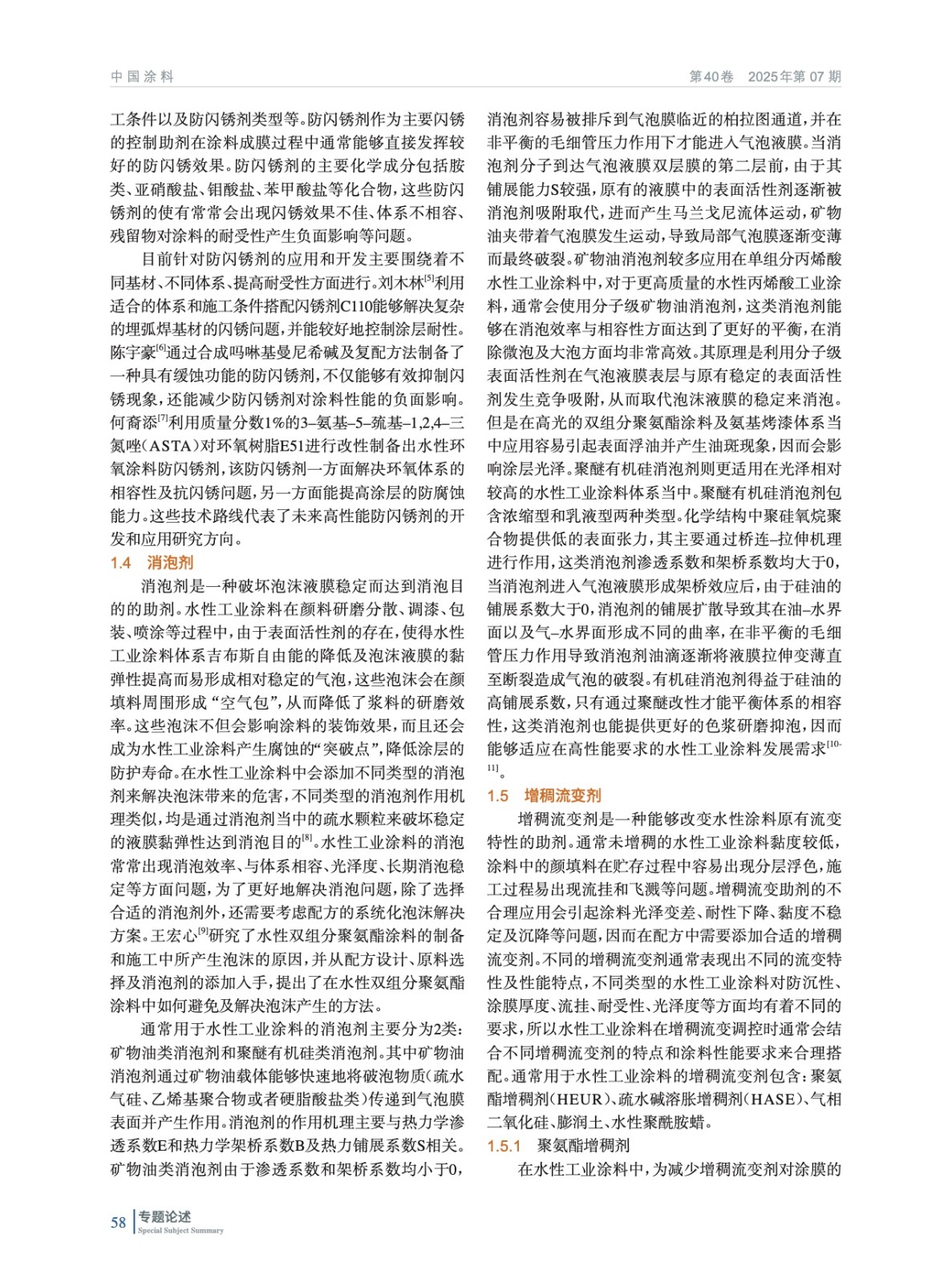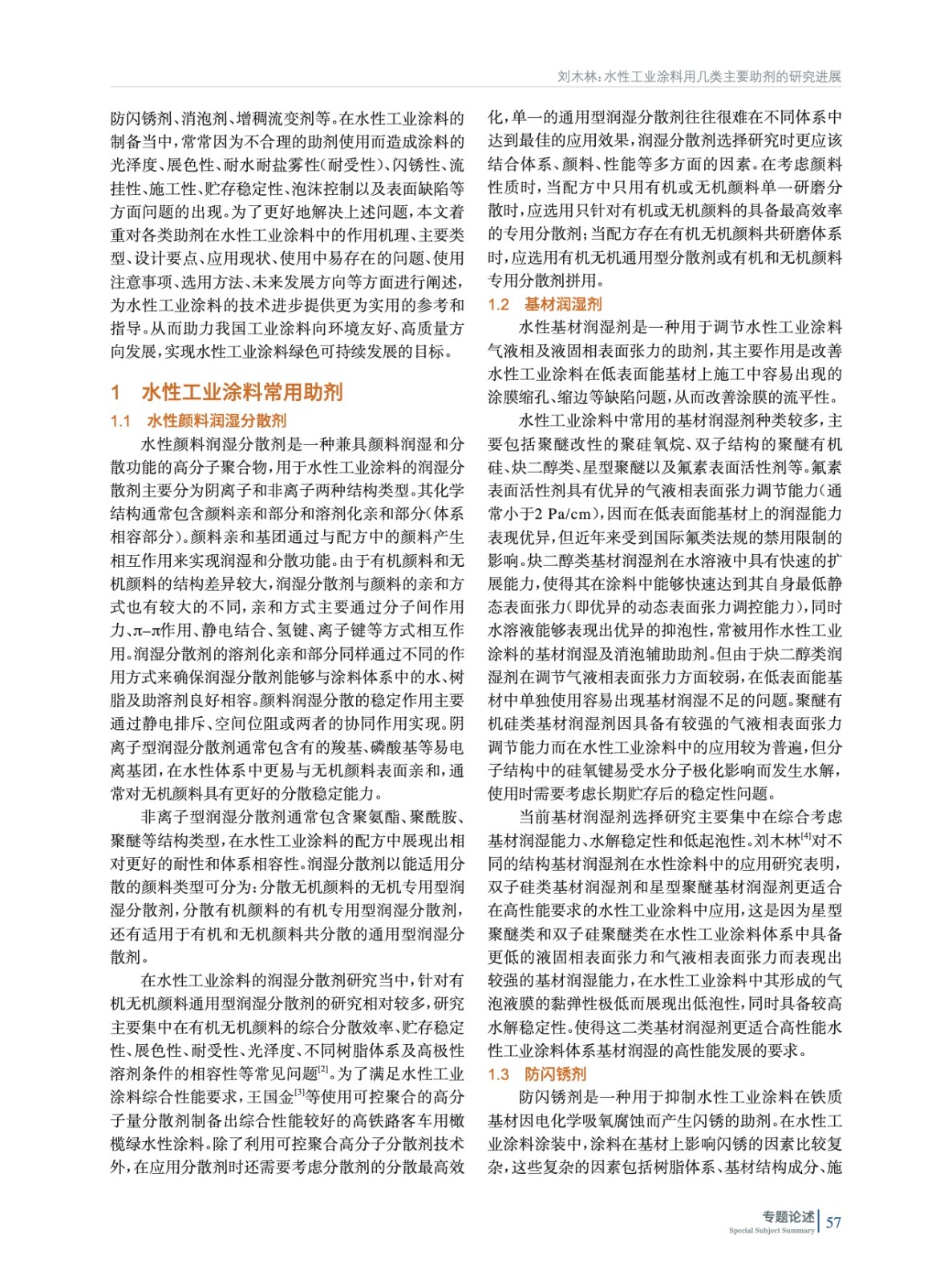 主要針對顏料潤濕分散劑、基材潤濕劑、防閃銹劑、增稠流變劑、消泡劑在水性工業涂料中應用的性能特點及研究進展進行綜述,并對助劑在水性工業涂料中的未來應用進行展望。