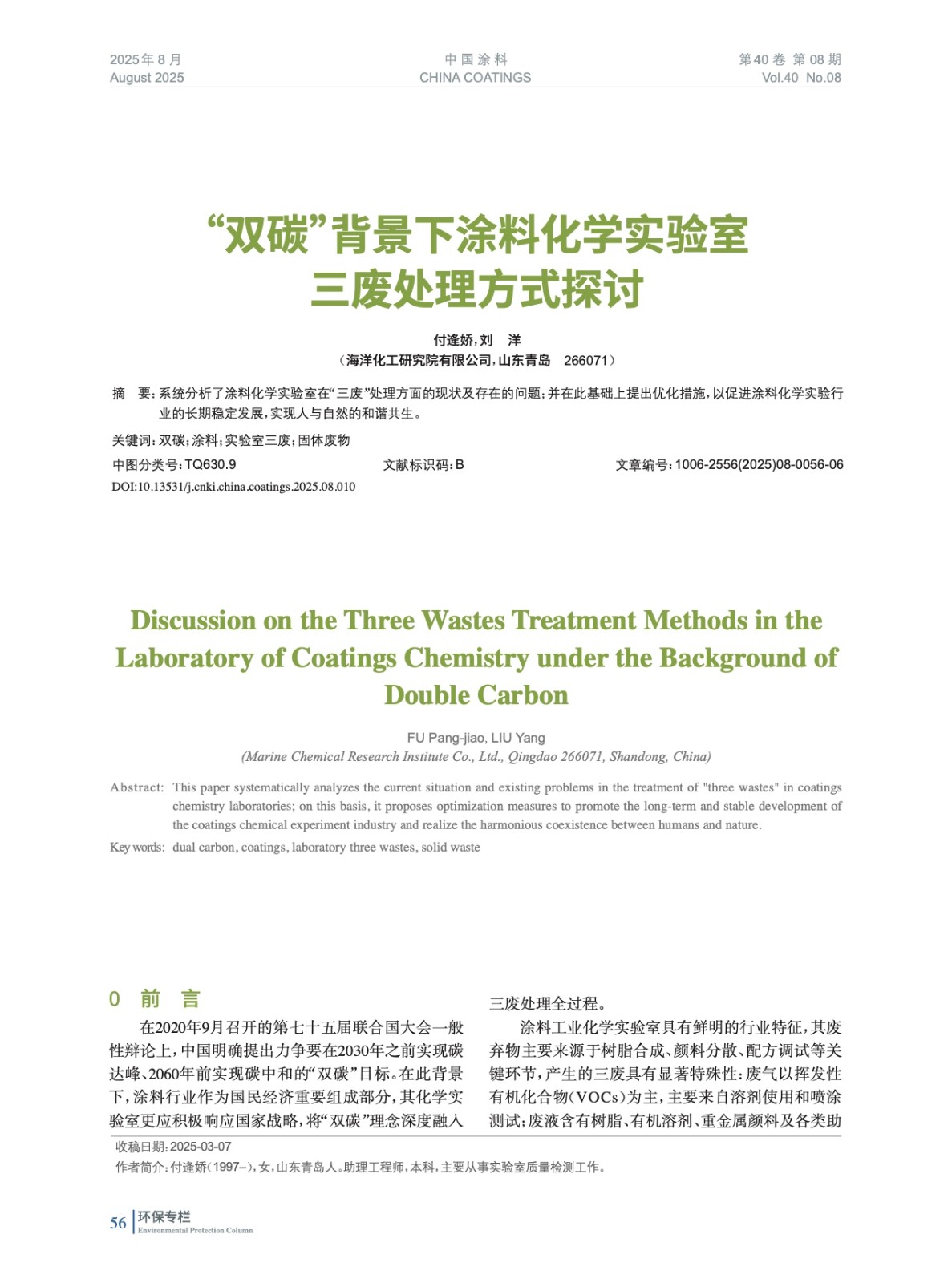 系統分析了涂料化學實驗室在“三廢”處理方面的現狀及存在的問題;并在此基礎上提出優化措施,以促進涂料化學實驗行業的長期穩定發展,實現人與自然的和諧共生。
