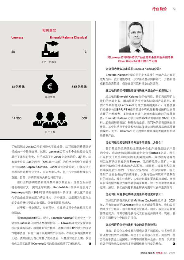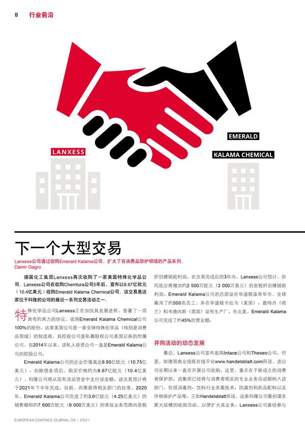Lanxess公司通過收購Emerald Kalama公司,擴大了在消費品防護領(lǐng)域的產(chǎn)品系列