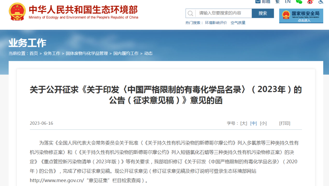 日前,中華人民共和國(guó)生態(tài)環(huán)境部發(fā)布公告,公開(kāi)征求《中國(guó)嚴(yán)格限制的有毒化學(xué)品名錄》(2023年)(征求意見(jiàn)稿)。意見(jiàn)指出:
