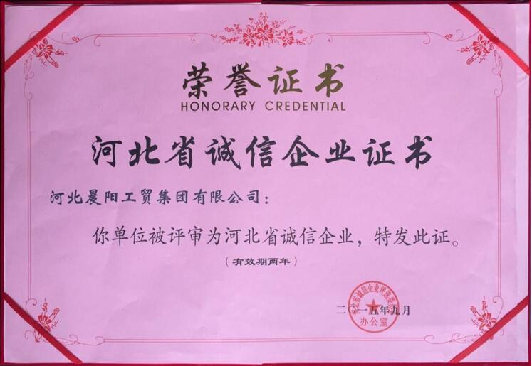 在河北省企業家協會等部門聯合開展的“河北省誠信企業”評選活動中,河北晨陽工貿集團有限公司被評為2015年“河北省誠信企業”,董事長劉善江榮獲“河北省企業誠信建設優秀工作者”稱號。