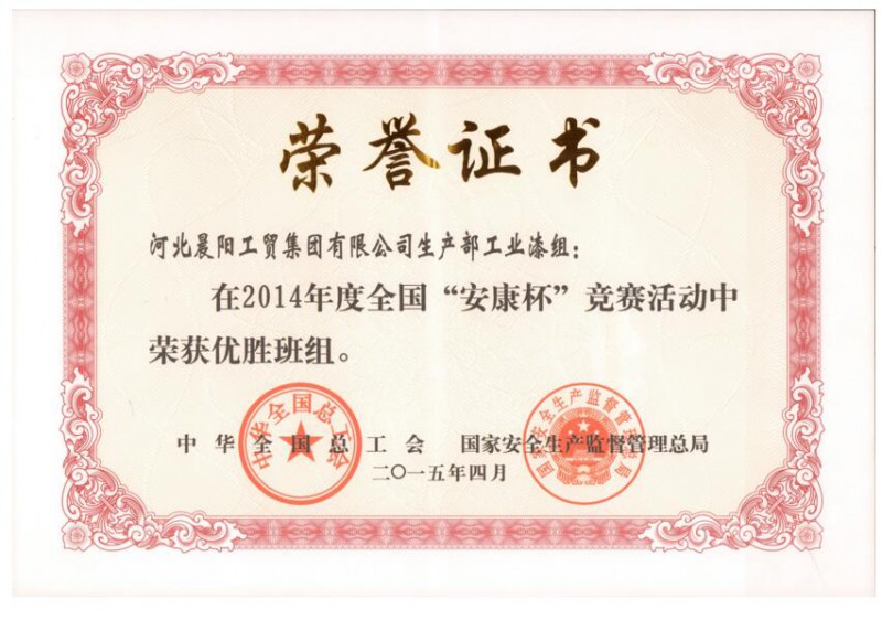 近日,河北晨陽工貿集團有限公司工業漆組被中華全國總工會和國家安全生產監督管理總局聯合授予2014年度全國“安康杯”競賽優勝班組。