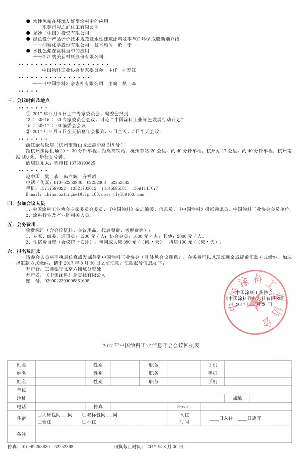 請參會人員將回執表傳真或發郵件到中國涂料工業協會(具體見會議聯系),會務費可以以現場現金或提前匯款方式繳納。如選擇匯款方式繳納,請于2017年8月30日之前匯款,匯款賬號信息如下:
