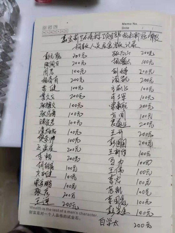 1月31日下午,在項目部負(fù)責(zé)人彭元聰?shù)某h下,大家踴躍捐款,你兩百,我一百,短短半天時間,項目部90多位員工就籌款1.14萬元,表現(xiàn)出了一方有難、八方支援的大愛精神。