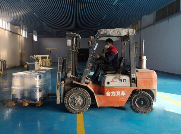 此時(shí),員工何海山開著叉車過(guò)來(lái)了,正準(zhǔn)備將剩下的一包防火涂料裝上車。“每包涂料22桶,都是工人們加班加點(diǎn)生產(chǎn)出來(lái)的。”何海山心里有數(shù),他已往車上裝了14包。