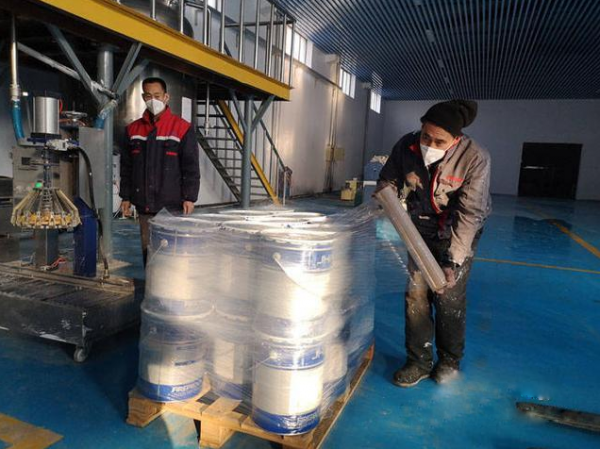 軍輝科技集團(tuán)有限公司員工正在對(duì)防火涂料打包