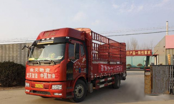 裝車地點(diǎn)離該公司廠區(qū)正門不足百米。記者看到,停靠在生產(chǎn)車間旁的這輛冀J牌照紅色貨車,車頭擋風(fēng)玻璃正下方和貨廂的一側(cè)分別懸掛著“救災(zāi)物資武漢加油中國(guó)加油”“軍輝防火心系疫區(qū)”紅色條幅,防火涂料已快裝滿了整個(gè)車廂。