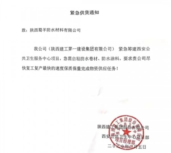 面對工期緊、任務重、人員少、物資運輸?shù)壤щy,北新建材安排北新蜀羊咸陽防水材料生產(chǎn)基地積極應對,立即成立專項工作小組,緊急協(xié)調(diào)生產(chǎn)、倉儲、物流等資源,經(jīng)過連夜溝通與各方面協(xié)調(diào),克服重重困難,保障了這輛滿載防水物資的車輛在最快時間內(nèi)抵達項目現(xiàn)場。