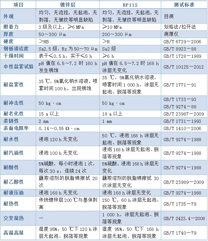 RP11S與鍍鋅層技術(shù)指標(biāo)對照表