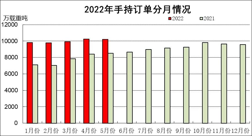 1~5月,全國造船完工1428萬載重噸,同比下降15.3%。承接新船訂單1769萬載重噸,同比下降46.0%。5月底,手持船舶訂單10220萬載重噸,同比增長20.2%。