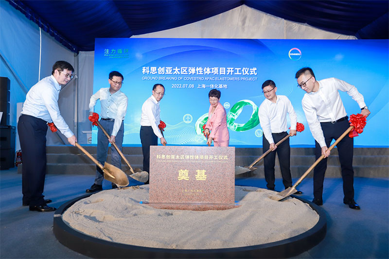 2022年7月8日,科思創彈性體新工廠在上海一體化基地破土動工:(左起)科思創彈性體事業部亞太區生產總監兼項目投資經理張品其、科思創上海一體化基地總經理陳耘博士、上海化學工業區管理委員會主任馬靜、科思創中國區總裁雷煥麗、科思創彈性體事業部亞太區總監陳敏、上海寰球工程有限公司總經理李宇鵬