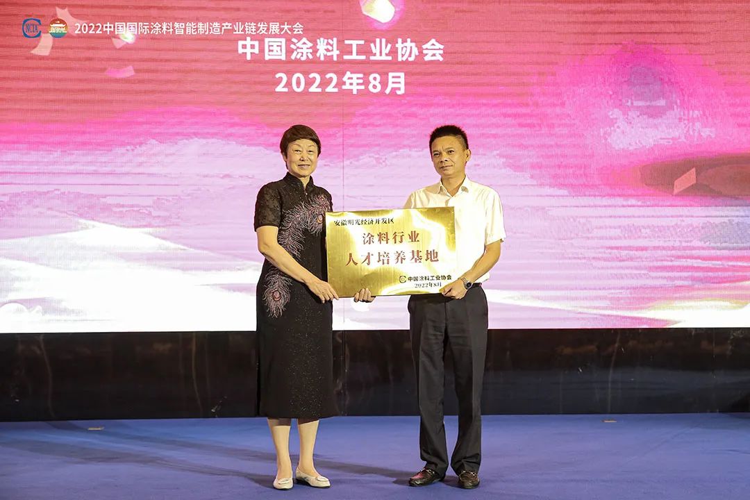 會上中國涂料工業協會會長孫蓮英為明光市經濟開發區“涂料行業人才培養基地”授牌,并和明光市人民政府副市長劉靜為《涂料行業智能工廠通用技術要求》、《涂料行業智能工廠評價規范》主要起草單位珠海市長陸工業自動控制系統股份有限公司、暨南大學等頒發證書;中國涂料工業協會副會長、武漢雙虎涂料有限公司董事長蔣紅升和安徽明光經濟開發區黨工委書記、管委會主任賈寶兵為標準參加起草單位嘉寶莉化工集團股份有限公司等頒發證書。