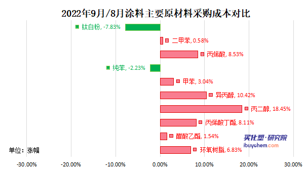中國(guó)涂料工業(yè)協(xié)會(huì)公布了9月涂料價(jià)格指數(shù)情況。其中,成品價(jià)格指數(shù)9月為117%,較上月下跌1%;原材料采購(gòu)指數(shù)9月數(shù)據(jù)為109%,較上月上漲4%,涂料產(chǎn)業(yè)鏈整體供給穩(wěn)定。