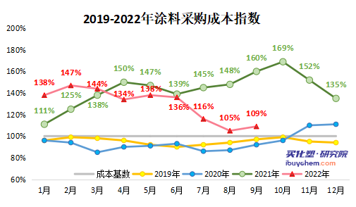 伴隨國(guó)際經(jīng)濟(jì)形勢(shì)和地緣沖突等影響,疊加新冠疫情和風(fēng)控影響,在涂料下游需求疲軟的情況,涂料上游原材料的行情波動(dòng)幅度陡然增加,單月漲跌幅超過(guò)20%,這對(duì)于涂料企業(yè)的采購(gòu)計(jì)劃,產(chǎn)生了非常不利的影響。原材料價(jià)格的變化雖波動(dòng)明顯但均值較高,涂料成品變化幅度不大但均值較低,成品價(jià)格的上漲幅度遠(yuǎn)不及原材料。如果從價(jià)格傳導(dǎo)來(lái)看,國(guó)內(nèi)涂料企業(yè)承擔(dān)較為嚴(yán)峻的成本壓力。如何建立起穩(wěn)健、有效的采購(gòu)策略和采購(gòu)計(jì)劃,來(lái)抵消原材料波動(dòng)帶來(lái)的被動(dòng)影響,將是目前涂料企業(yè)保證企業(yè)利潤(rùn)的工作之一。