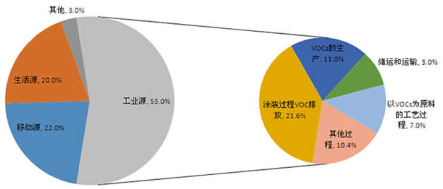 表面涂裝VOCs排放量:據(jù)相關(guān)科研單位估算,表面涂裝排放占工業(yè)源的21.6%,占人為源的12%