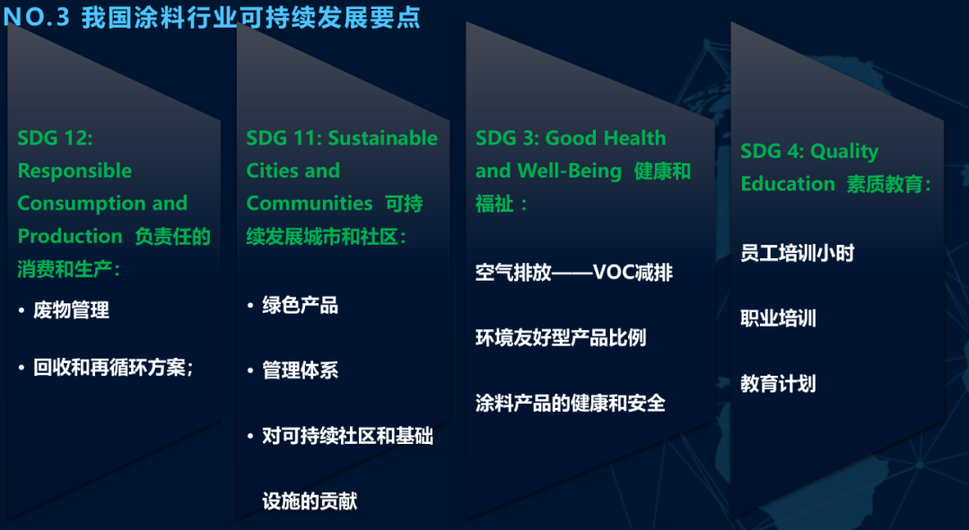 為此,中國涂料行業也要跟上全球涂料行業的發展步伐,要聚焦“負責任的消費和生產”、“可持續發展城市和社區”、“健康和福祉”、“素質教育”這四大關鍵點進行發展。