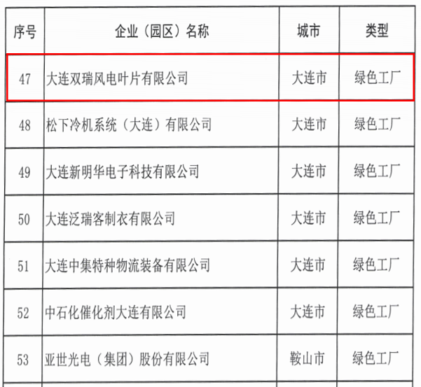 經公司自評、第三方機構評審、遼寧省工業和信息化廳現場核查、論證、評估、公示等環節,10月25日遼寧省工業和信息化廳正式公布了《2022年(第七批)省級綠色制造名單》,大連雙瑞成功獲得“省級綠色工廠”榮譽稱號。這是雙瑞風電第一次榮獲此類榮譽,標志著雙瑞風電綠色制造邁上了新臺階,實現了新突破。