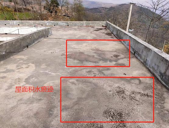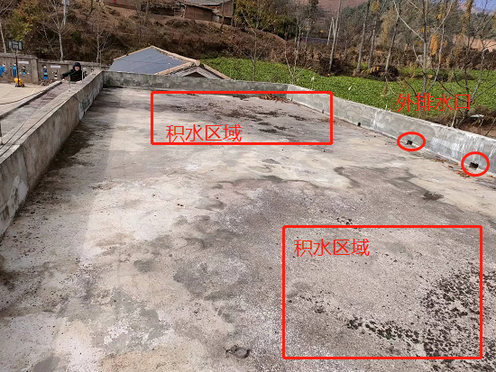 在考察的過程中,韓工發(fā)現(xiàn)小學是老舊屋面,大面積分布著龜裂紋,同時存在較大裂縫,漏水較為嚴重。整個屋面無找坡層,平整度較差,低洼處存在嚴重的積水現(xiàn)象,且落口管口全部被雜物堵死。