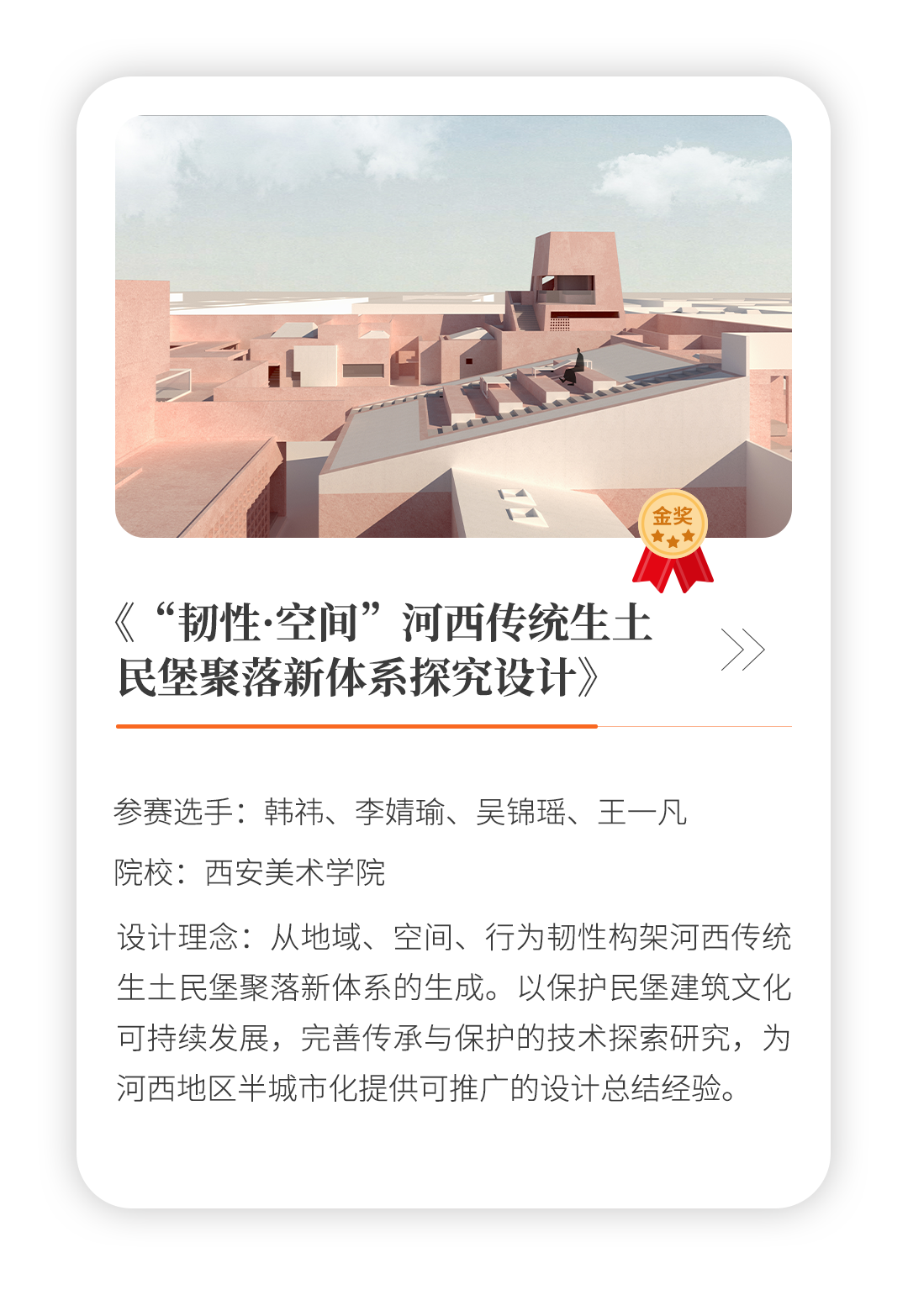 賽事設置建筑設計和室內設計兩條賽道,圍繞“生態人居,永續精‘彩’”這一主題對作品提出了不同的要求。在八位專業評委與聯合主辦方評審團的見證下,來自西安美術學院的韓祎、李婧瑜、吳錦瑤、王一凡創作的《“韌性·空間”河西傳統生土民堡聚落新體系探究設計》和來自清華大學美術學院的姚金昊、李禹霏創作的《夢境邊緣—酒吧設計》脫穎而出,分別摘得建筑組和室內組金獎。