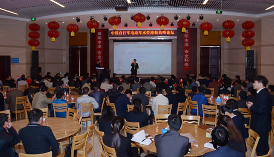 以“環(huán)保涂裝 綠色出行”為主題的中國自行車、電動車水性涂裝高峰論壇4月12日在晨陽水漆舉行。晨陽水漆高層領導,中國自行車協(xié)會培訓中心主任鄭培東,全國自行車工業(yè)信息中心副主任國長軍, 100余家自行車、電動車廠家領導和代表參加,共商水性涂裝發(fā)展大計。