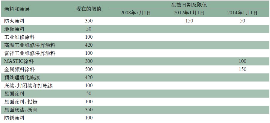 南海岸空氣質量管理區規定1113是從2003年1月1日起,分5年分階段實施的,其中一些產品的最后期限是2008年7月1日。{BiMis:page}    SCAQMD Rule 1113的最新版本是2011年6月3日的修訂版,接上一版本的2008年7月1日,分2012年1月1日和2014年1月1日兩個階段。部分涂料和涂層的VOC限值見表3。