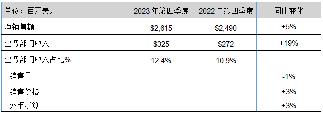 2023年度實現了創紀錄的凈銷售額,約為182億美元,較上年增長3%左右。在銷售價格上漲的帶動下,有機銷售額增長了3%。調整后每股收益也創下歷史新高,增長了27%,原因包括銷售價格上漲、投入成本下調、結構性成本節省和有利的外幣折算,但被銷量下降部分抵消。年末,投入成本和庫存水平仍高于歷史水平。