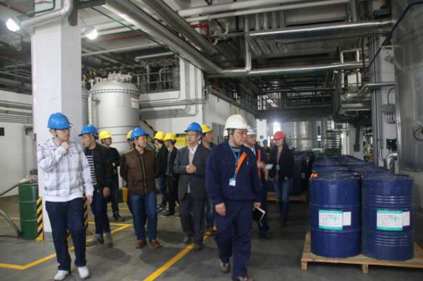 參觀的醇酸和聚酯合成釜是容量25m3,采用釜外兌稀,一釜可生產40多噸固體分50%的醇酸或聚酯樹脂,體現了規模化生產,提高生產效率,且產品質量穩定。